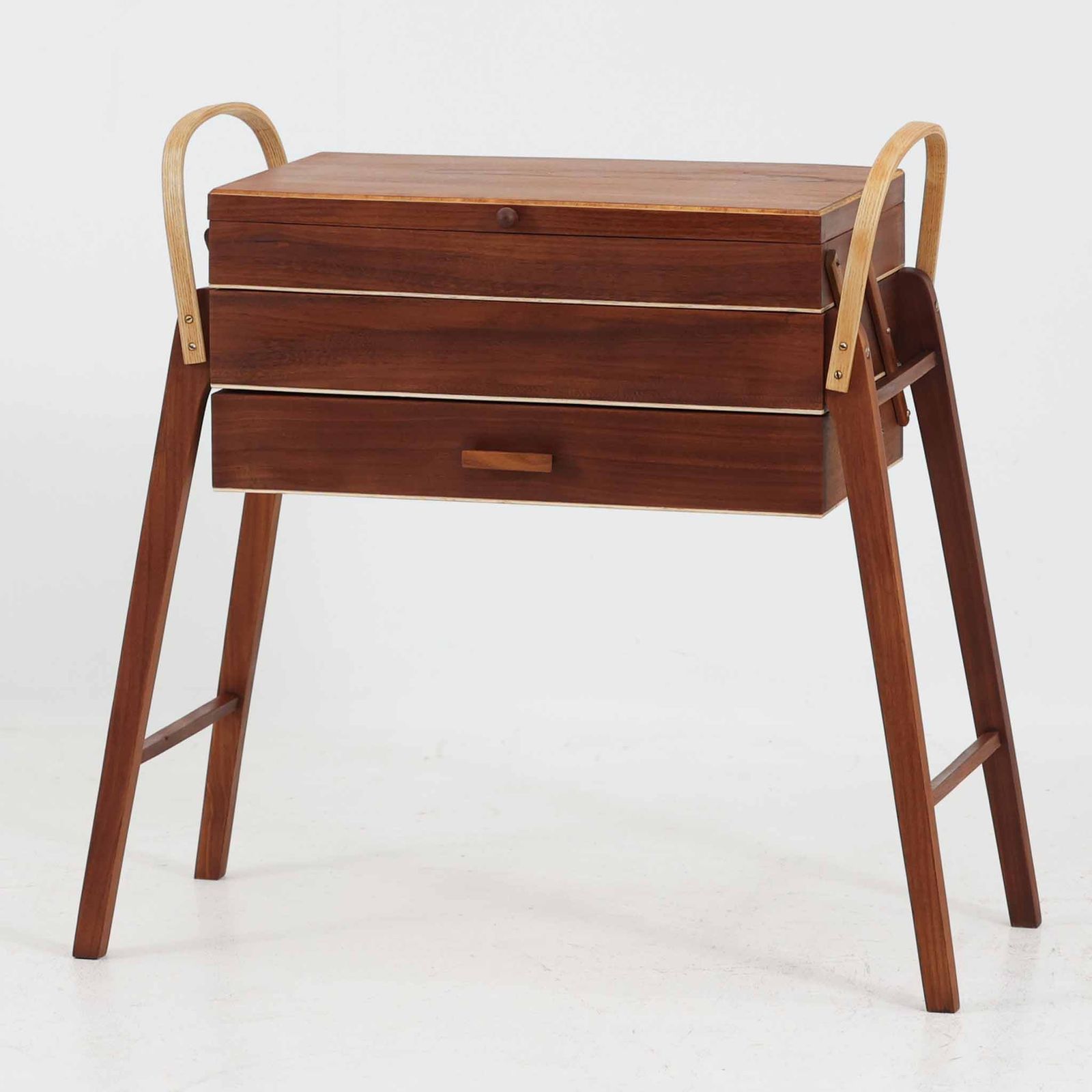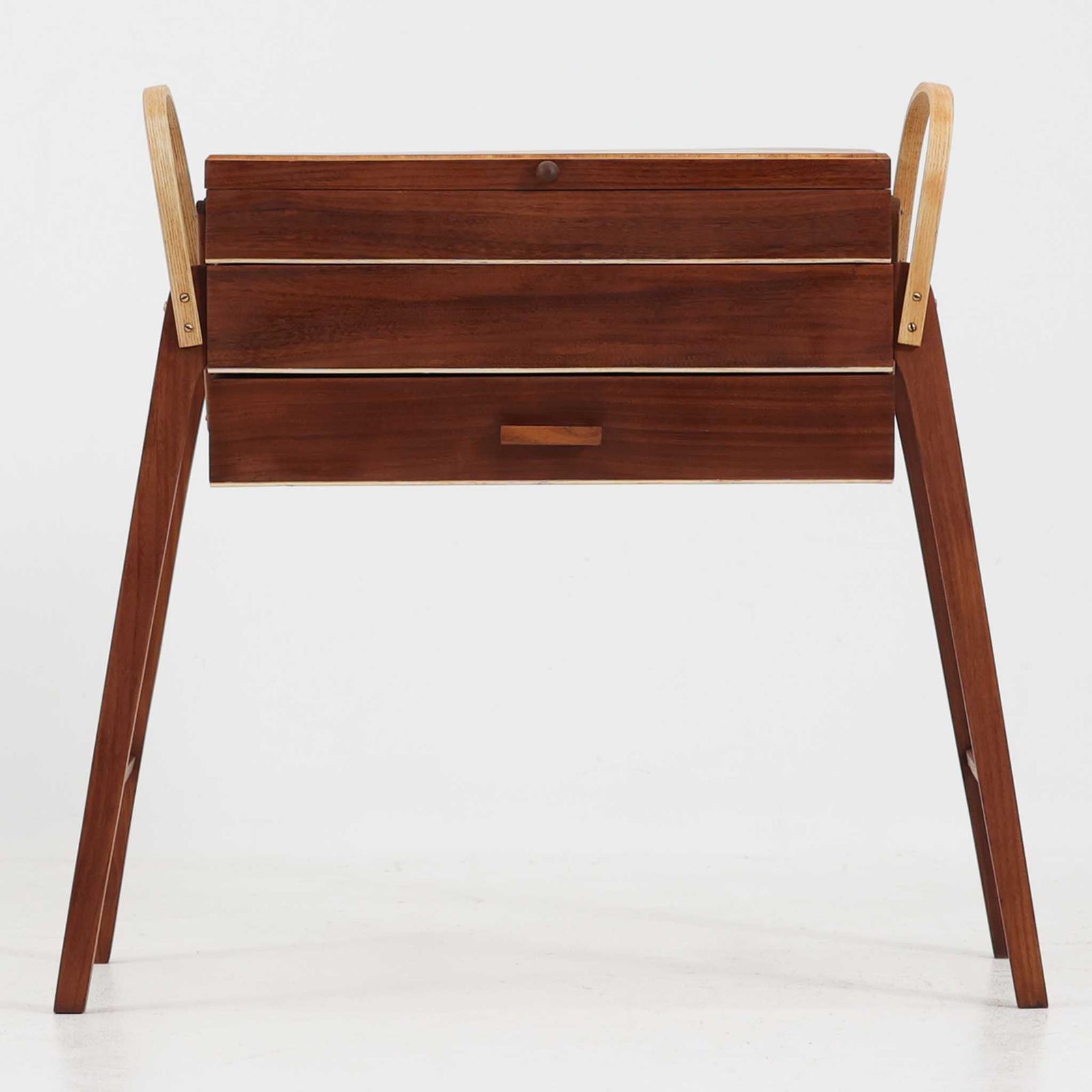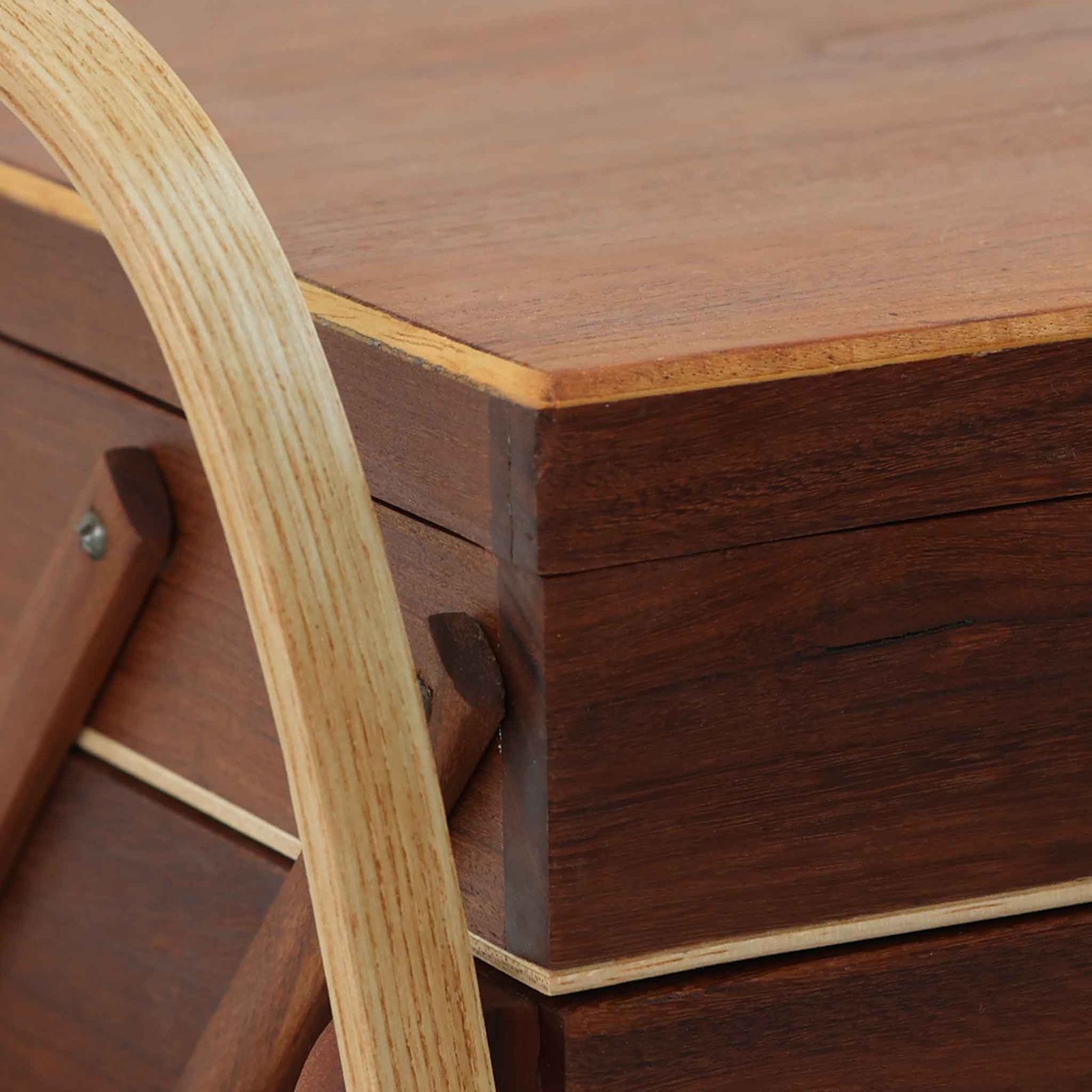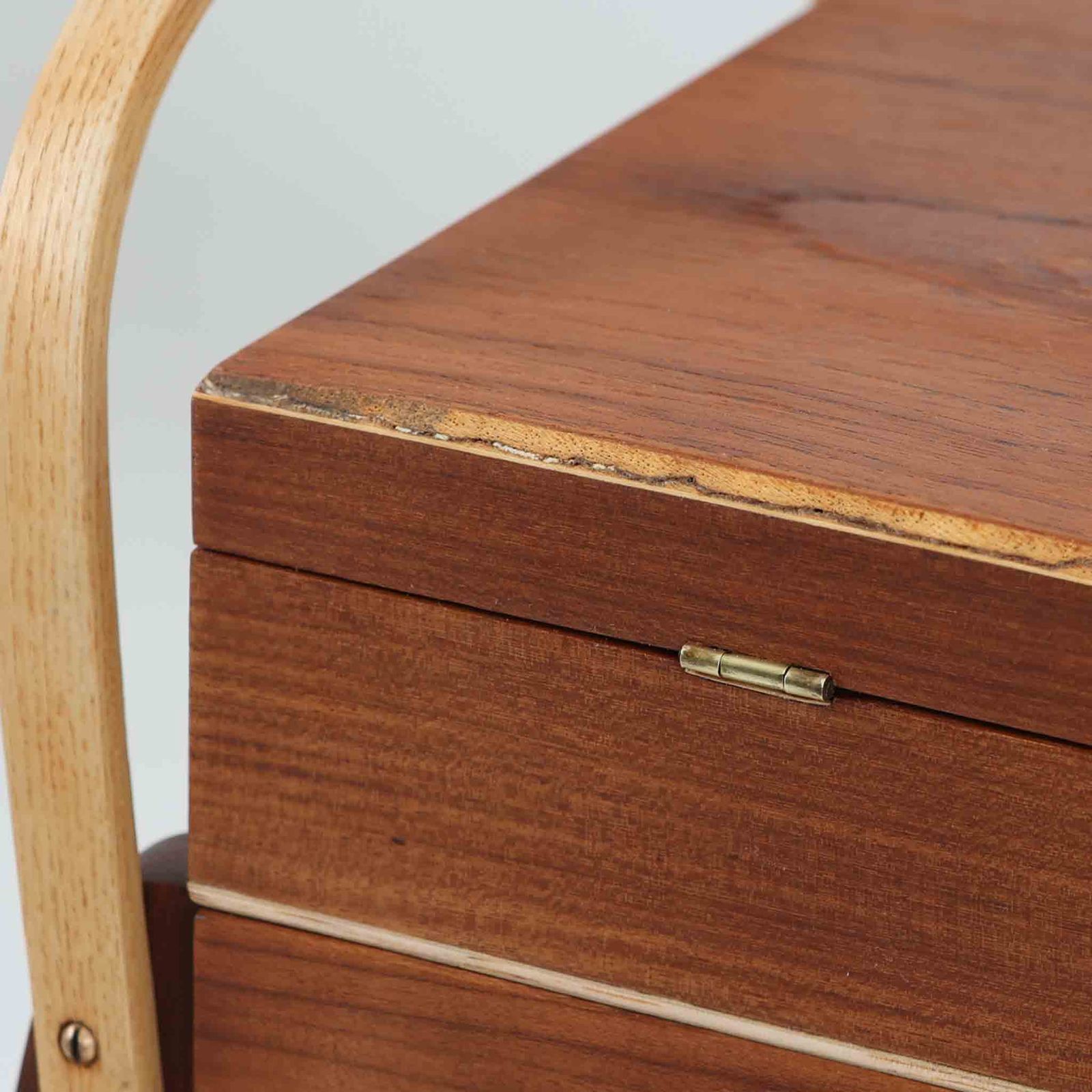 こちらのソーイングボックスは、チーク材とビーチ材を組み合わせた軽やかな構成が魅力の北欧ビンテージ品で、トップのフラップを開くと段違いに展開するトレイと下段の引き出しが現れる優れた収納構造を備え、裁縫道具や小物を効率よく整理できます。柔らかく曲げられた左右のビーチ材の持ち手がアクセントとなり、職人技の感じられる繊細な作りと経年で深まった木肌の風合いが空間に温かな存在感をもたらします。リビングやワークスペースのサイドテーブルとしても実用的にお使いいただけます。