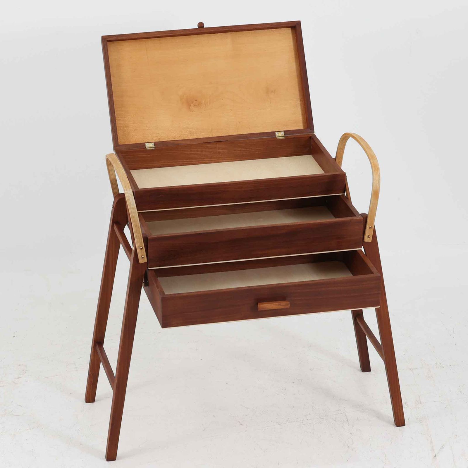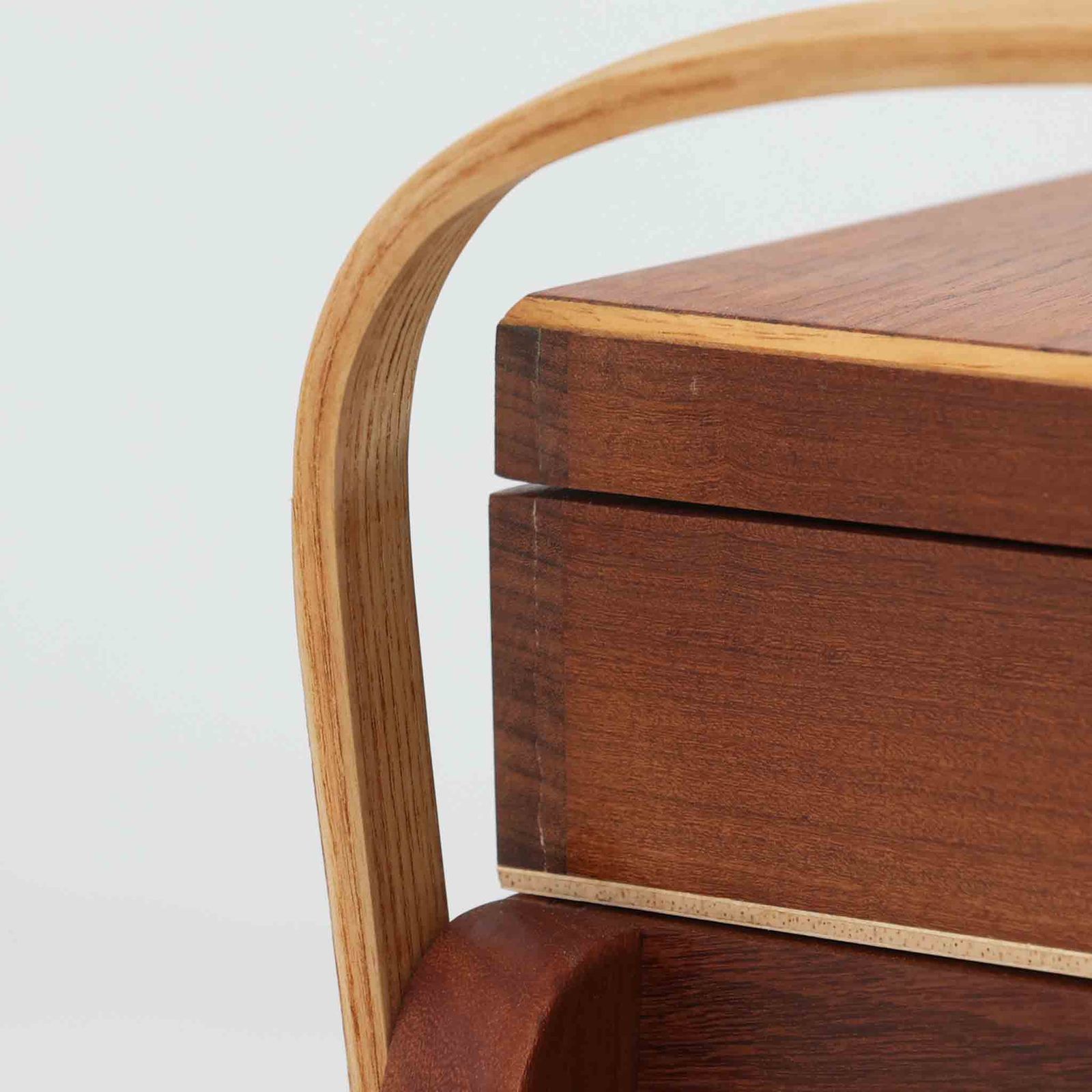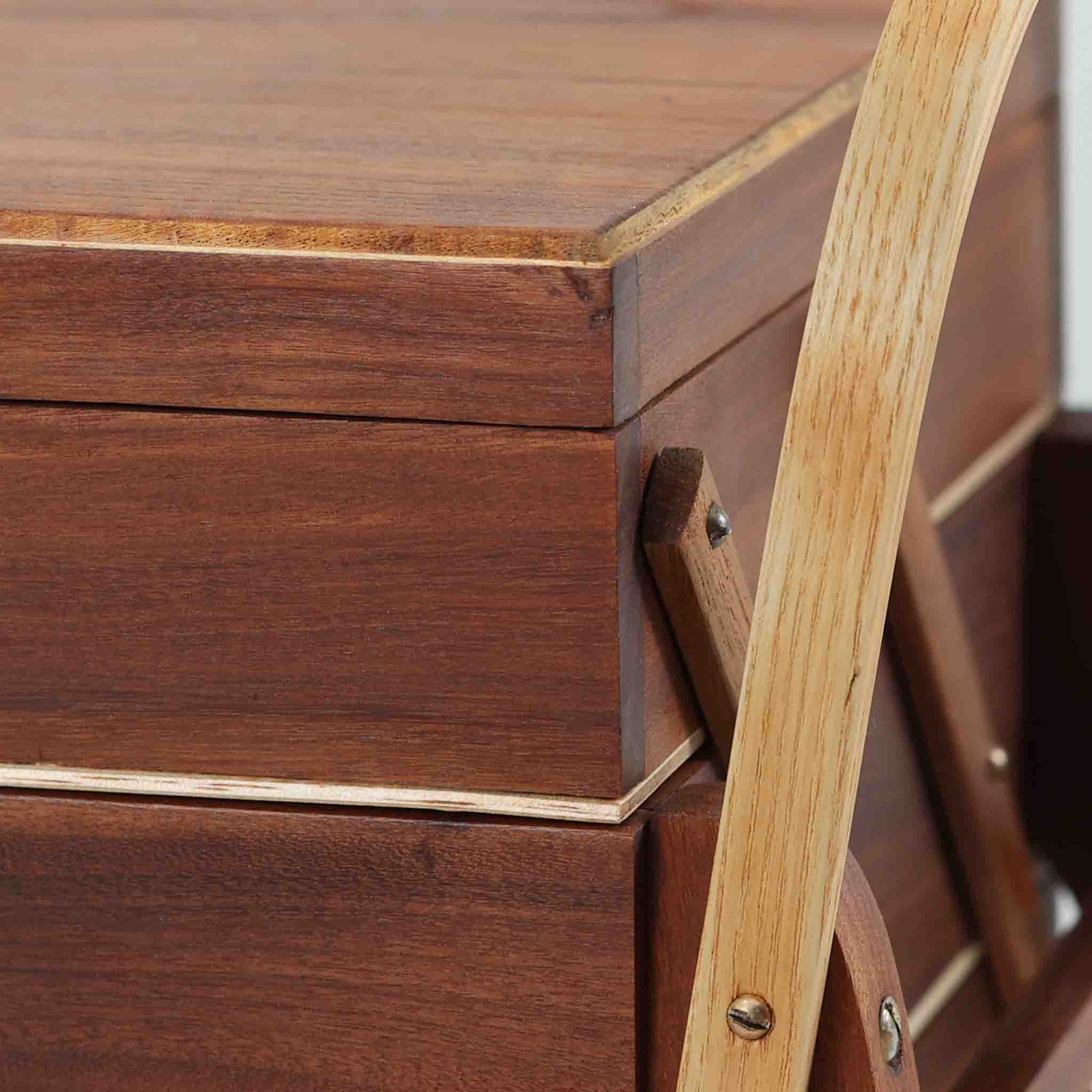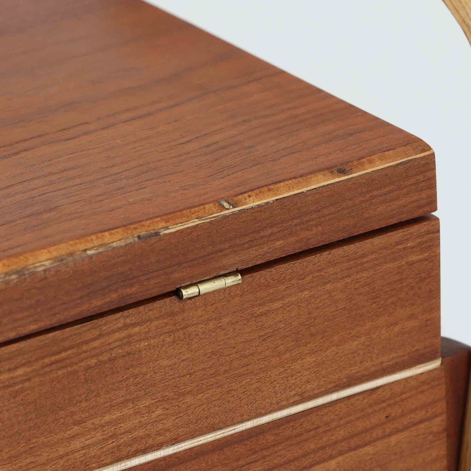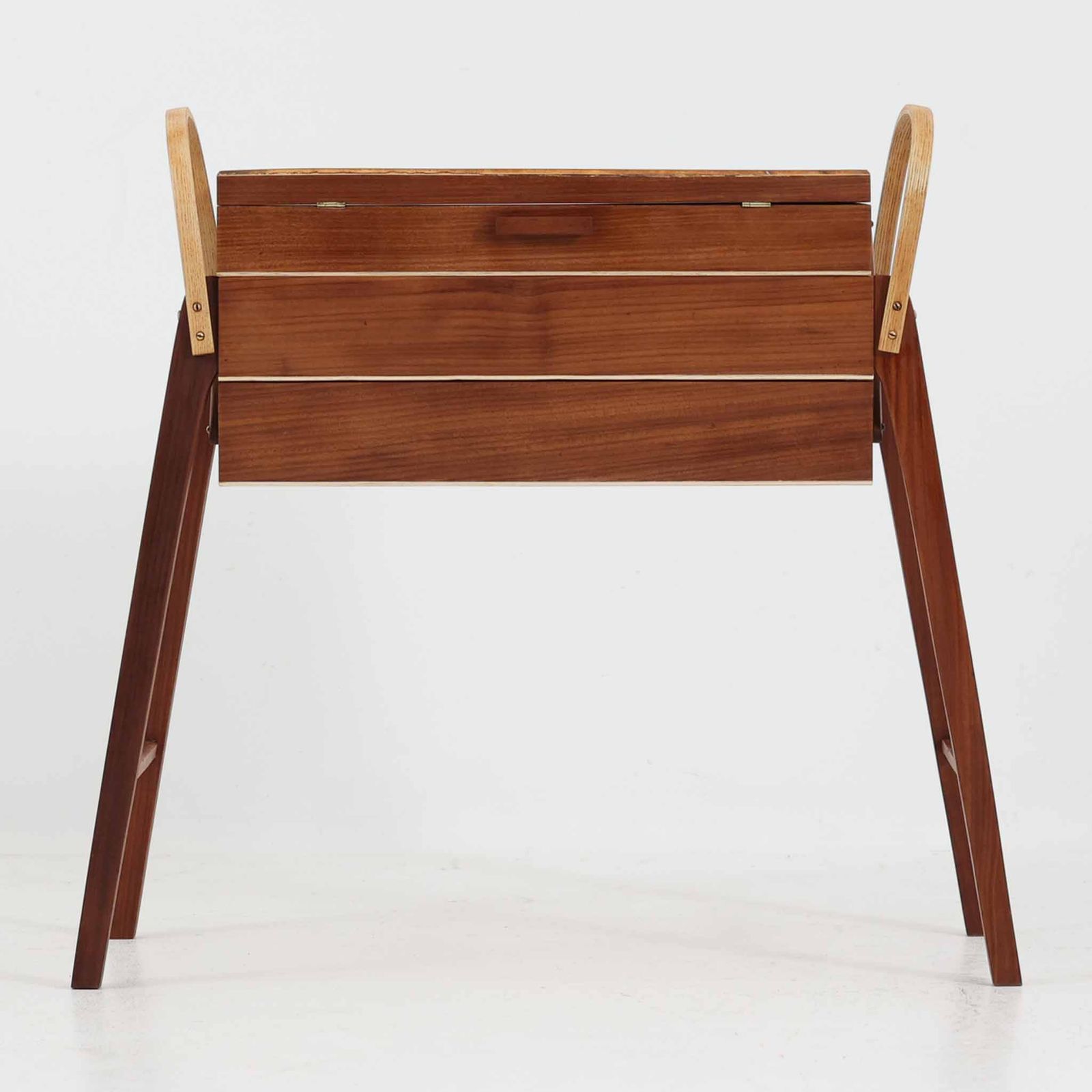 こちらのソーイングボックスは、チーク材とビーチ材を組み合わせた軽やかな構成が魅力の北欧ビンテージ品で、トップのフラップを開くと段違いに展開するトレイと下段の引き出しが現れる優れた収納構造を備え、裁縫道具や小物を効率よく整理できます。柔らかく曲げられた左右のビーチ材の持ち手がアクセントとなり、職人技の感じられる繊細な作りと経年で深まった木肌の風合いが空間に温かな存在感をもたらします。リビングやワークスペースのサイドテーブルとしても実用的にお使いいただけます。