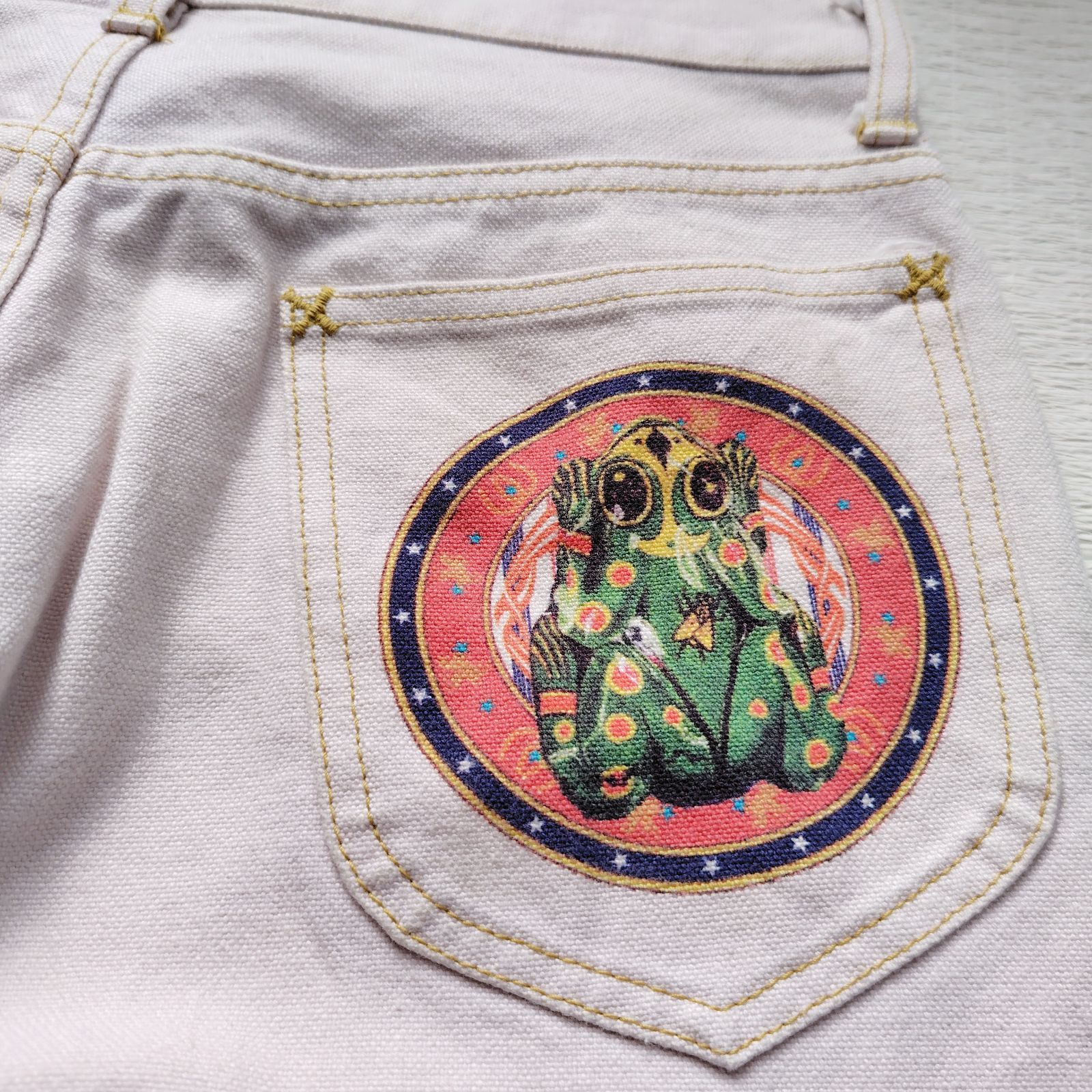 柔らかなライトピンクのデニムキャンバスに、岡本氏のタッチで描かれた躍動感あるカウボーイと、バックポケットの愛らしいカエルが強烈なインパクトを放ちます。
