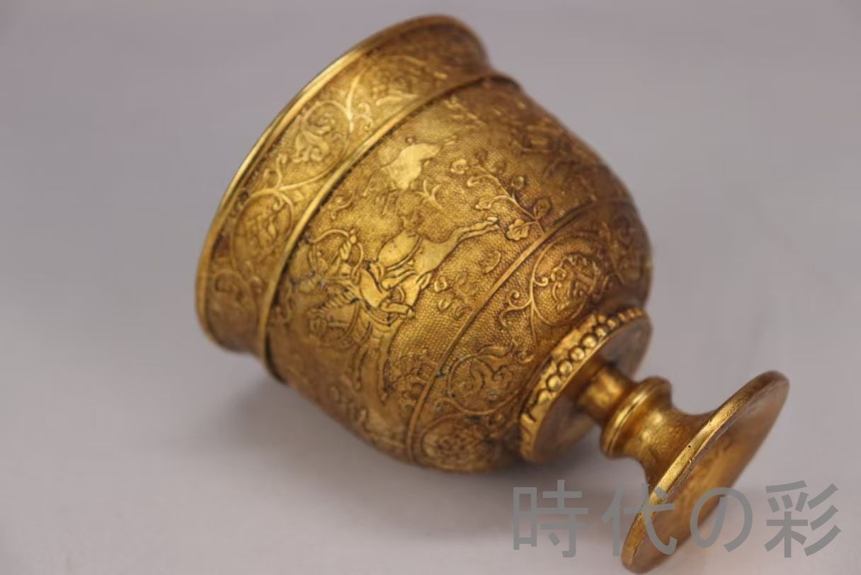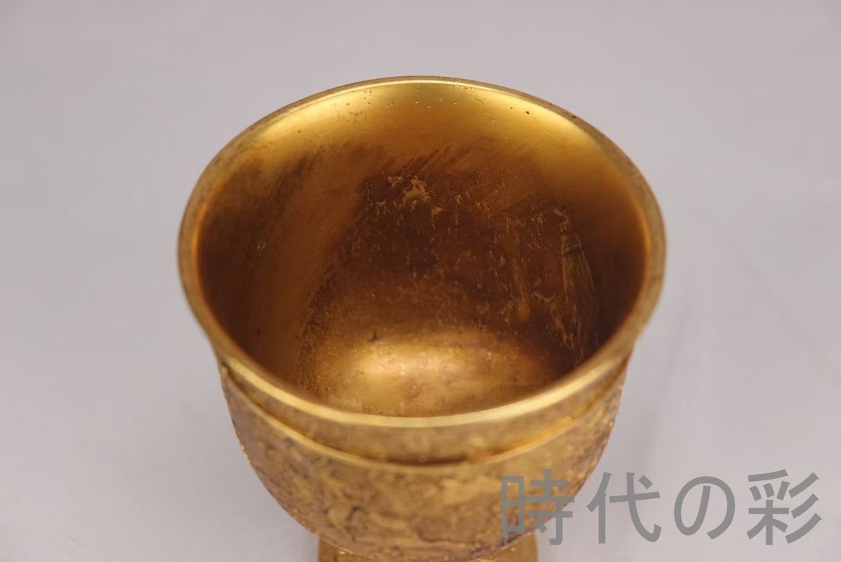 精銅を厚実に鋳造した旧蔵酒杯。鍍金が柔らかく残り円満な形と重みが魅力の古酒器。