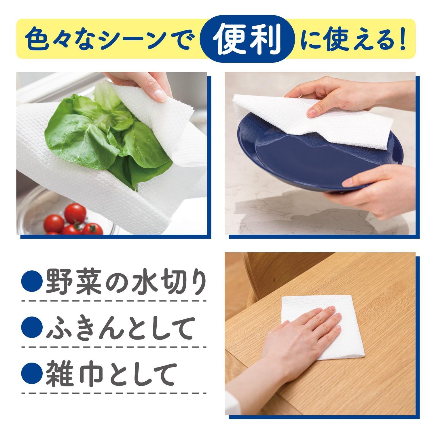 水に濡らしても破れにくい、丈夫なペーパータオルです。布のような丈夫さと紙のような吸収性をもつ不織布タイプ。ギュッとしぼれて繰り返し使えて経済的。ふっくら厚手シート。食器拭きに、野菜の水きりに、布巾・ぞうきんに、キッチンまわりのおそうじに、リビングのおそうじにまで、幅広く活躍します。まとめ買いにお得な6ロール入り。