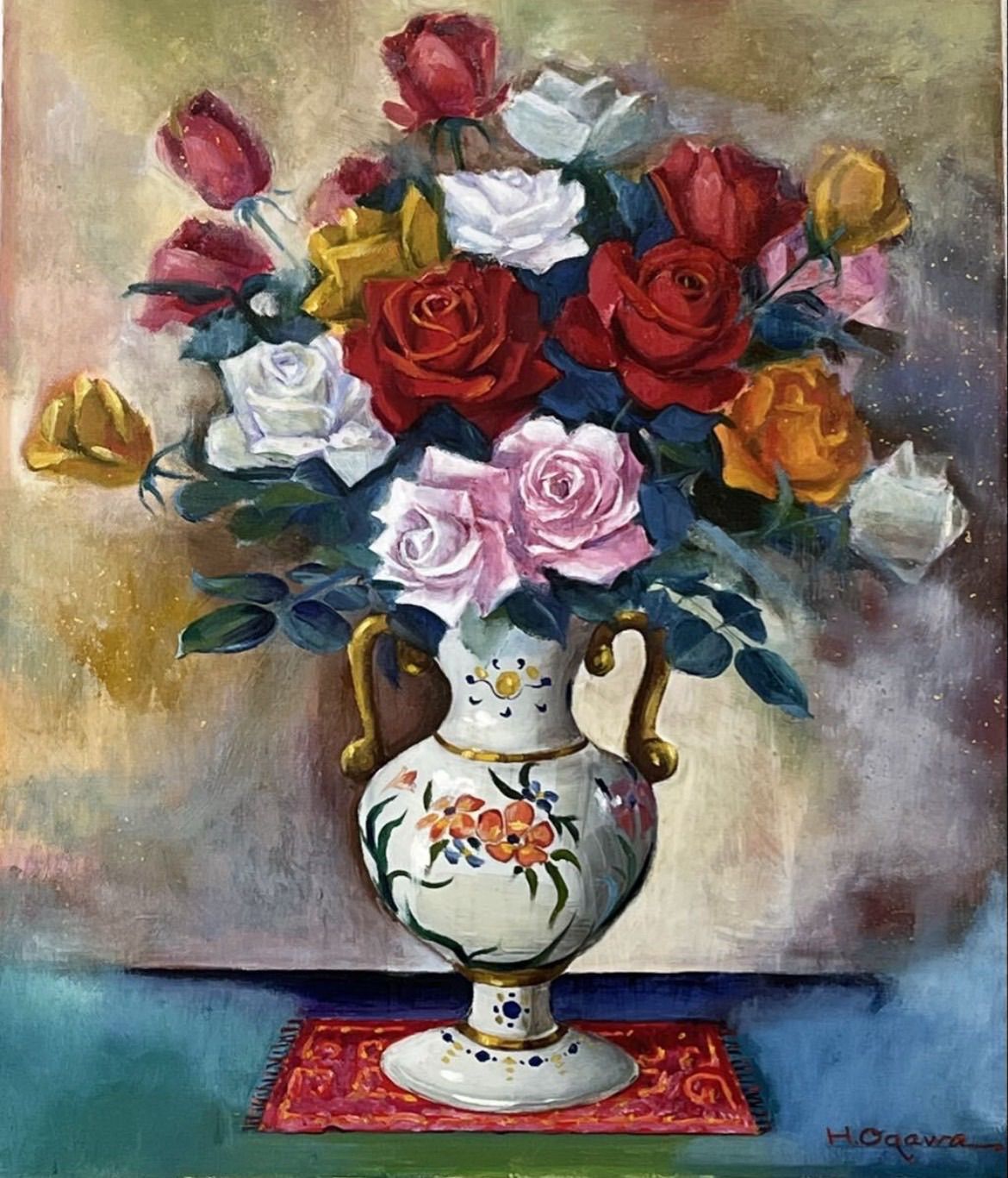 小川等 「薔薇図」油彩 10号 静物画 直筆サイン入り 示現会会員 岐阜県出身 師 江崎寛友