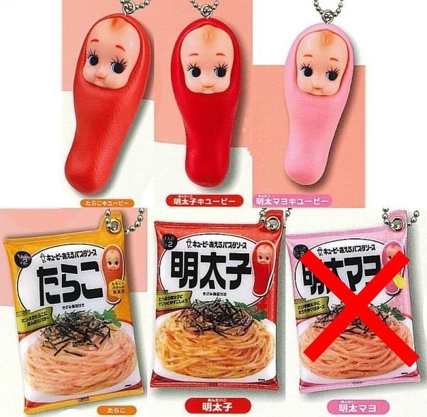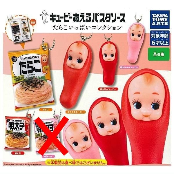 「キューピーあえるパスタソース」のパッケージと2024年に生誕20周年を迎えた「たらこキューピー」がガチャでミニチュア化。