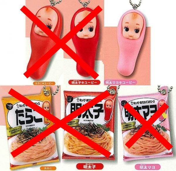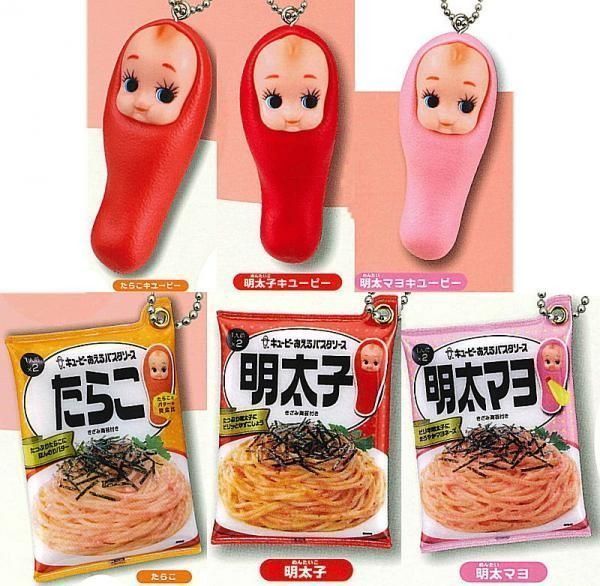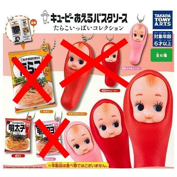 「キューピーあえるパスタソース」のパッケージと2024年に生誕20周年を迎えた「たらこキューピー」がガチャでミニチュア化。