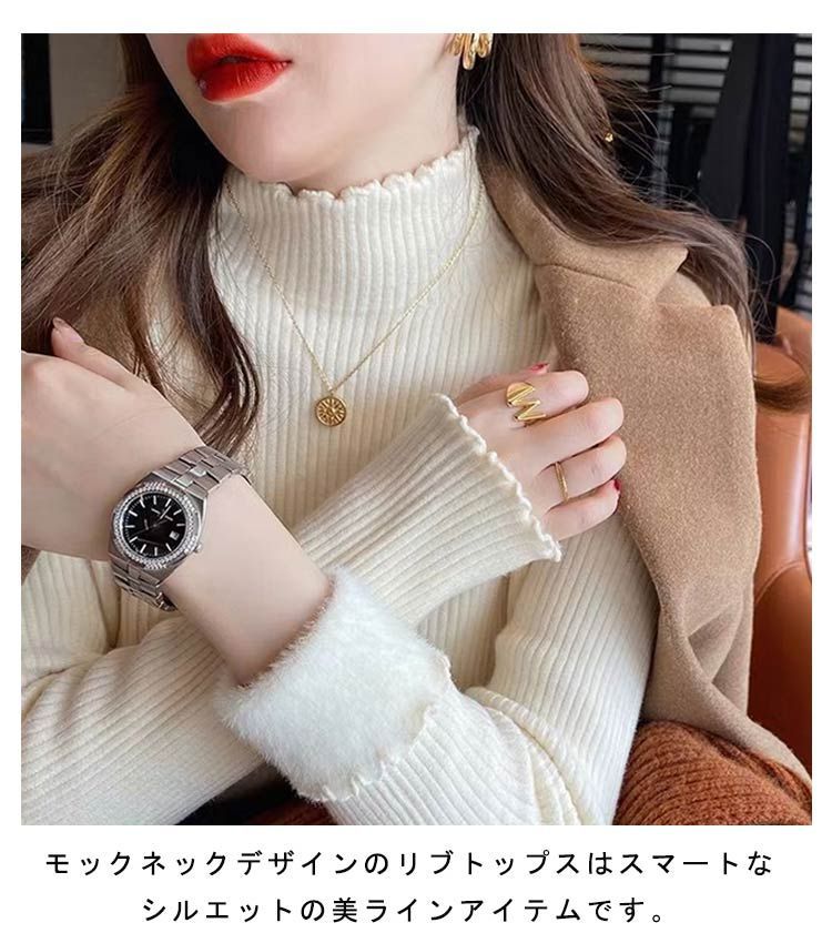 モックネックデザインのリブトップスはスマートなシルエットの美ラインアイテムです。