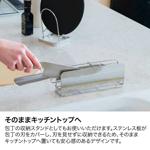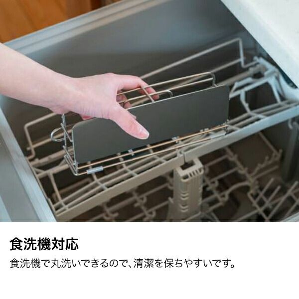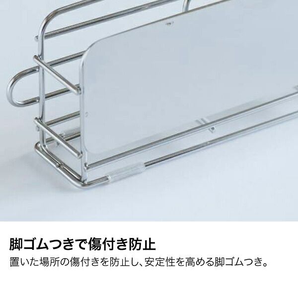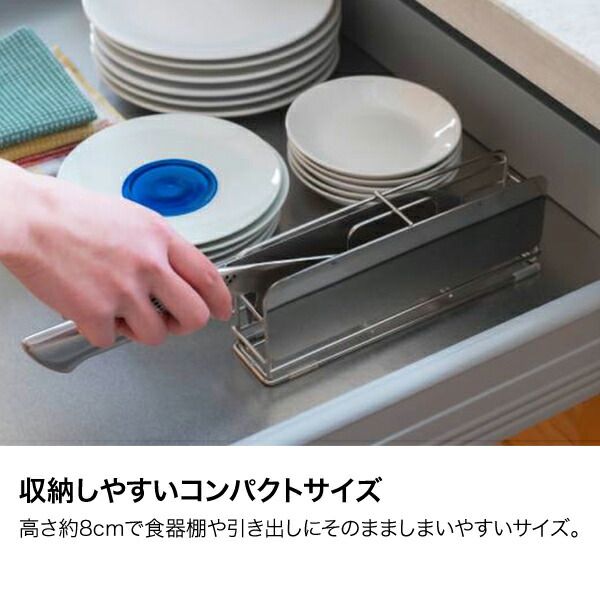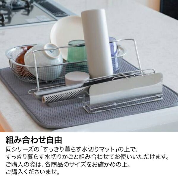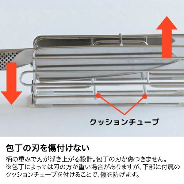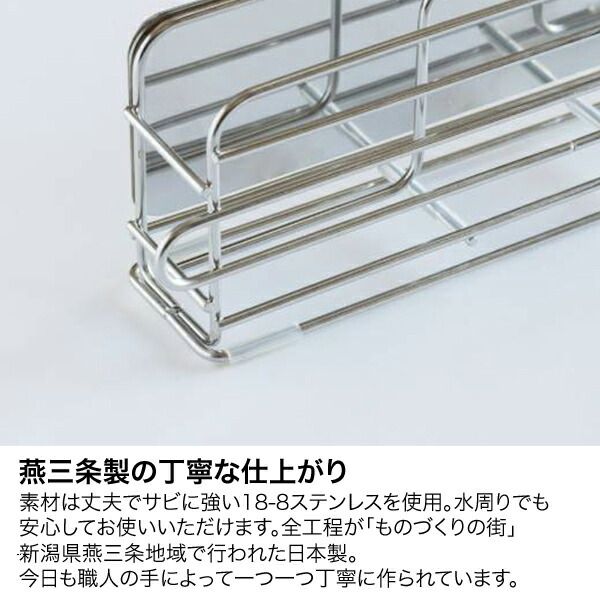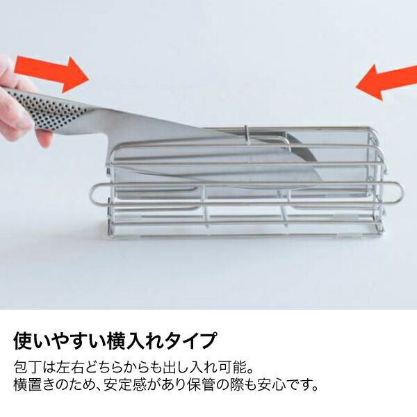 横入れ式で出し入れしやすく、刃が浮く設計で傷つけにくいのも特長です。水切りマットや他の水切りかごと組み合わせても使え、キッチントップでの収納も◎。コンパクトで吊り下げ収納も可能、食洗機対応。18-8ステンレス製でサビに強く、新潟県燕三条製の安心品質です。