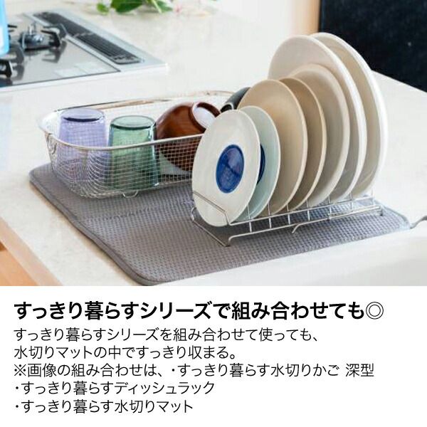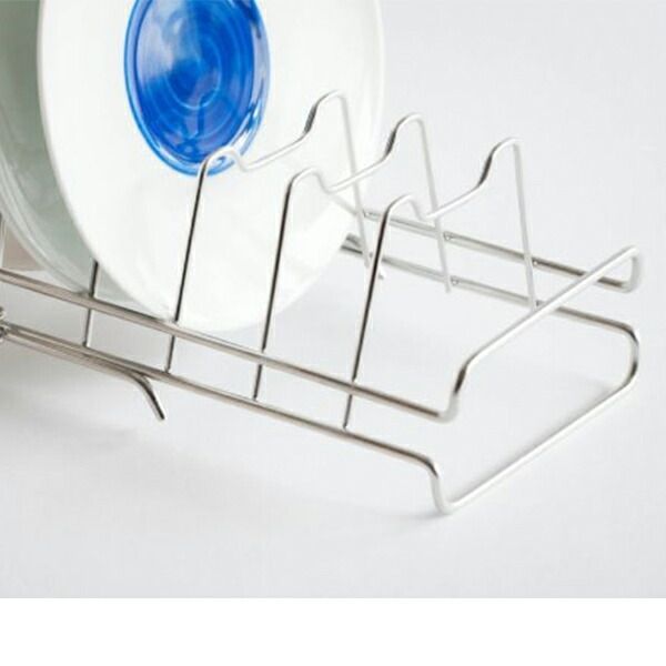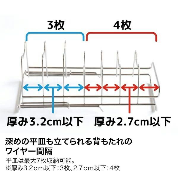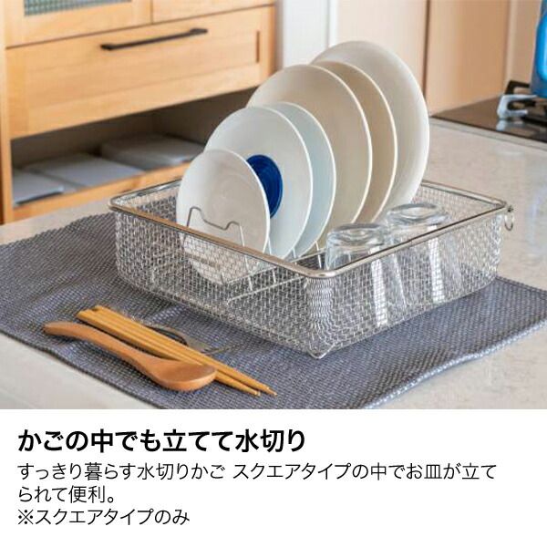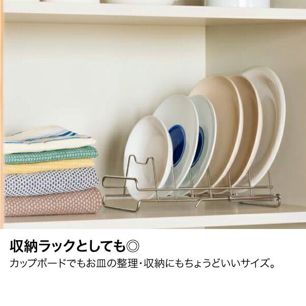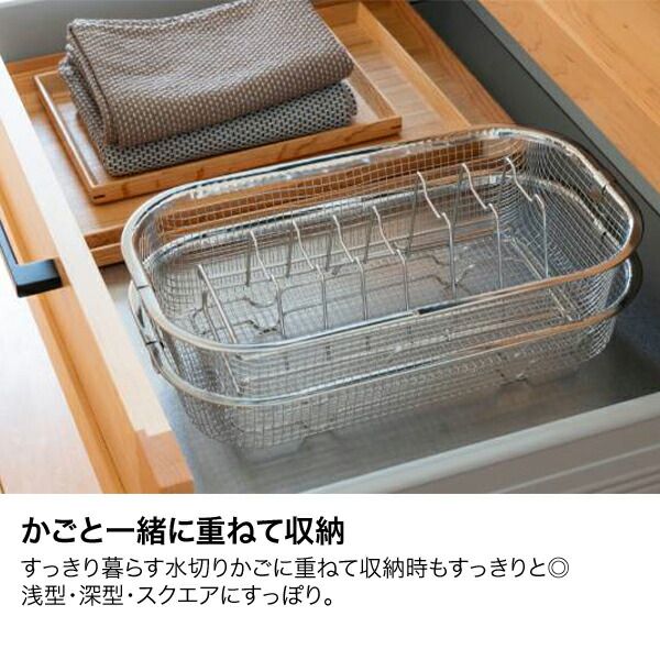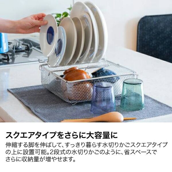スクエアタイプの水切りかごにセットすれば、2段式として省スペースで収納力アップ。最大7枚まで収納可能で、カップボードでの整理棚としても便利。