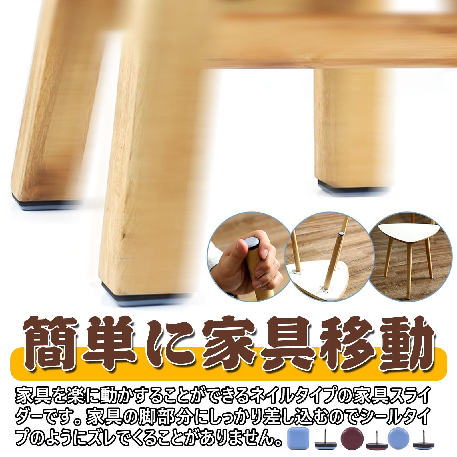 【サイズ】直径25mm 【内容量】30個 。家具を楽に動かすることができるネイルタイプの家具スライダーです。家具の脚部分にしっかり差し込むのでシールタイプのようにズレでくることがありません。