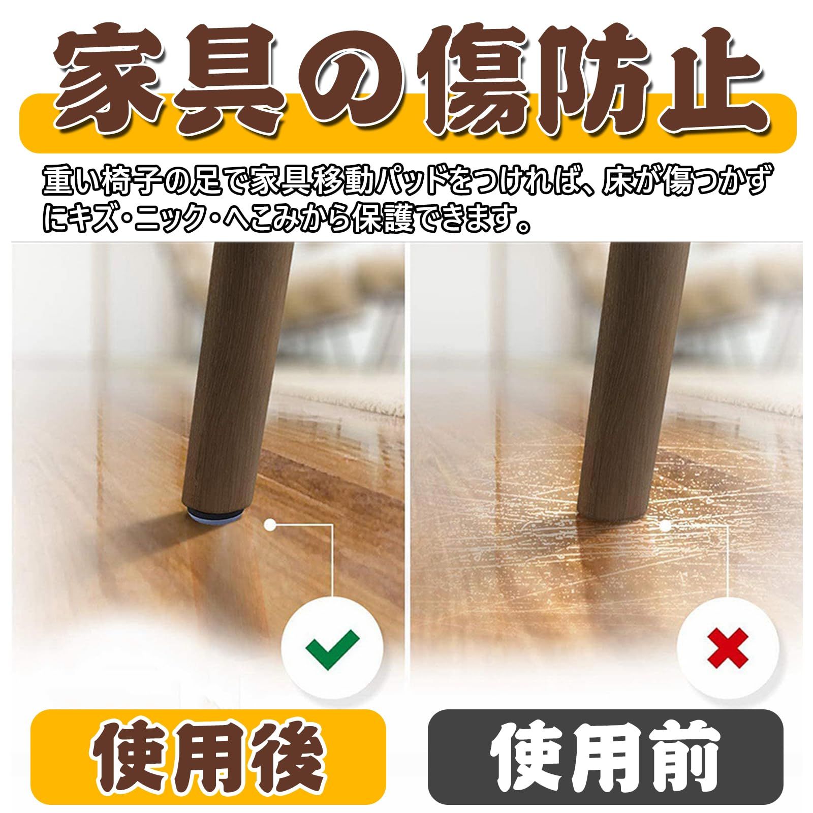 【傷やへこみを防止】重い椅子の足で家具移動パッドをつければ、床が傷つかずにキズ・ニック・へこみから保護できます。床や畳などの傷防止できます。