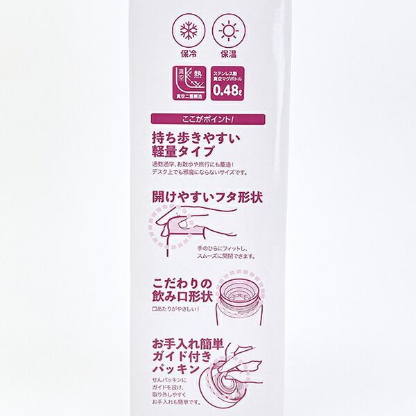持ち歩きやすい軽量タイプのステンレスボトルです。手のひらにフィットし、スムーズ開閉できるフタ形状で飲み口の口当たりが優しいのがポイント♪容量:480ml 【サイズ:6.7cm×6.7cm×19.5cm 素材:ステンレス ポリプロピレン シリコーンゴム】 【サイズ:6.7cm×6.7cm×19.5cm 素材:ステンレス ポリプロピレン シリコーンゴム】