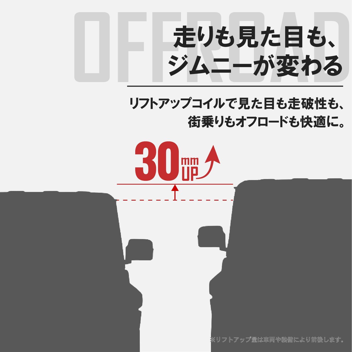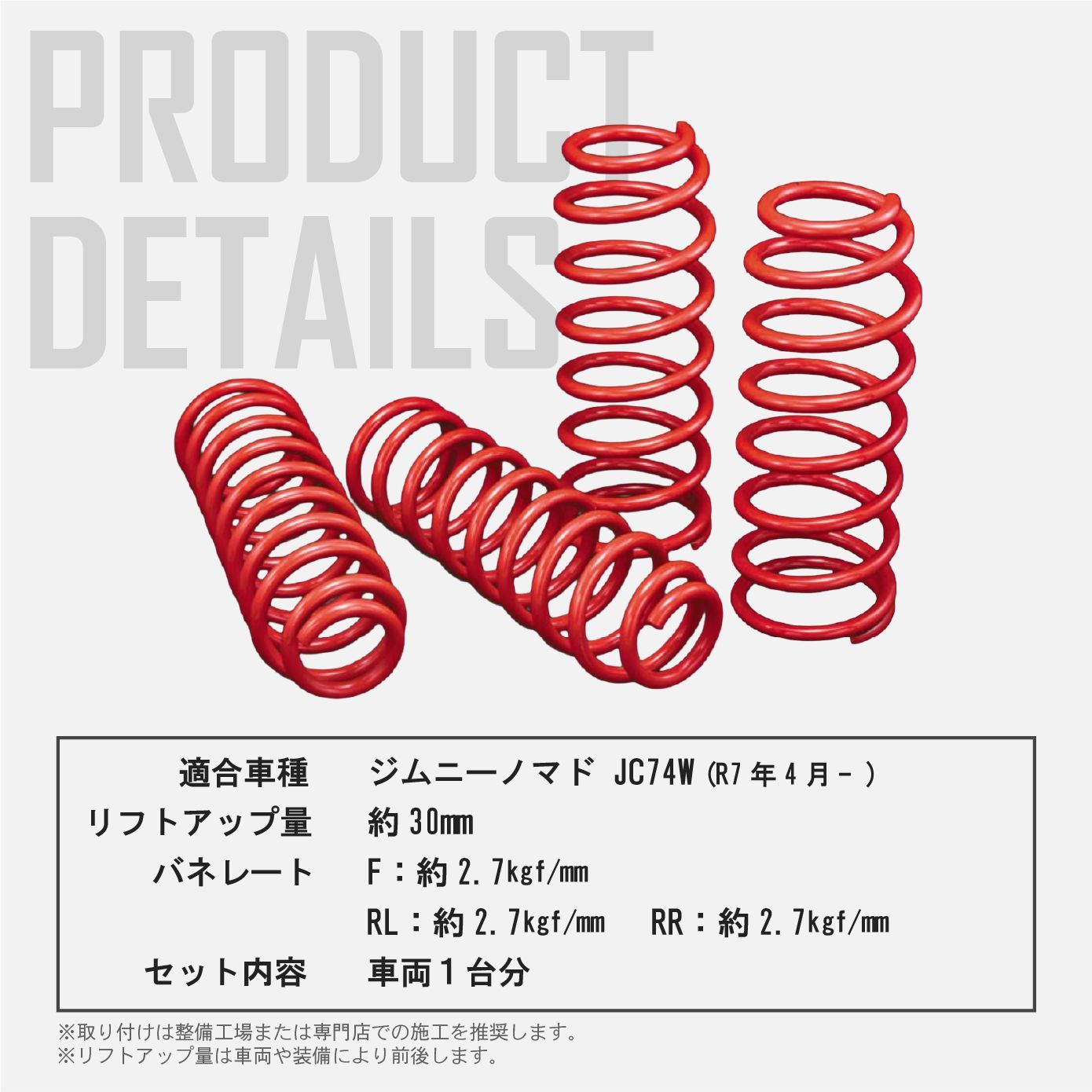 ジムニー ノマド JC74W 約30mmUP 30mmアップ リフトアップ コイルスプリング 車高アップ リフトアップコイル ノマド カスタム 4WD オフロード サスペンション コイル交換 スプリング交換 安定性向上 乗り心地 改善 走破性向上 キャンプ アウトドア 林道 未舗装路 雪道 対策 足回り 強化 車検対応 純正ショック対応 タイヤハウス クリアランス拡大 大径タイヤ ワイドタイヤ 装着しやすい 見た目アップ ワイルドスタイル カスタムSUV リフトアップキット JC74 リフトアップ JC74W コイル強化 トラベル オフロード走破性UP 車高調整 ジムニー ノマド用 パーツ 外装パーツ 足回りパーツ カスタムパーツ