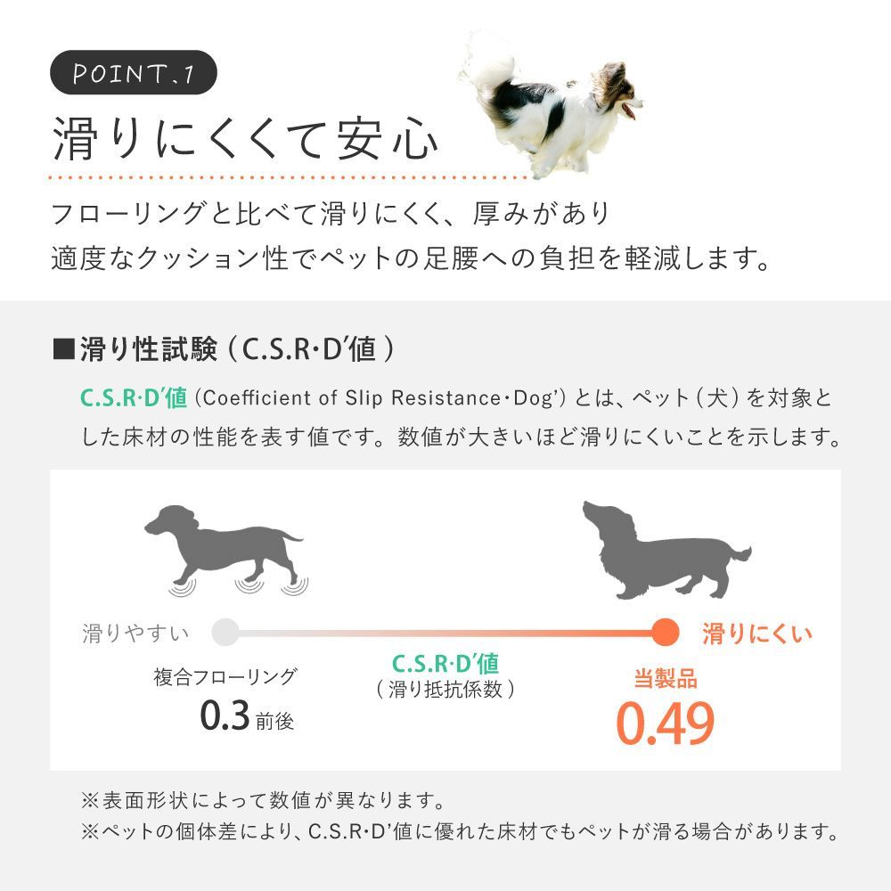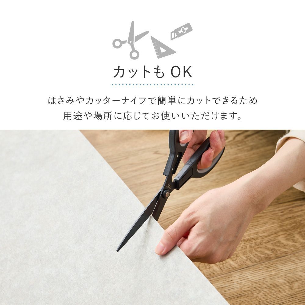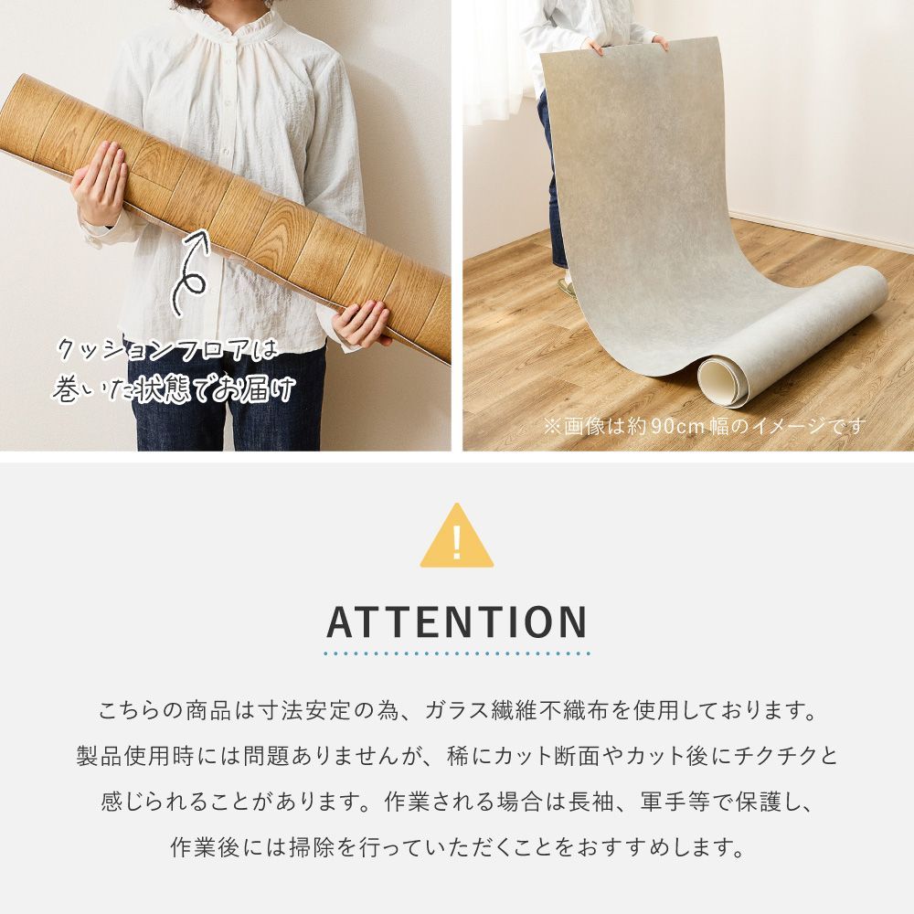 表面のコーティングによりワックスいらずでお手入れ簡単!防滑性・耐久性を備え傷がつきにくく、通常のクッションフロアより厚みがあり適度なクッション性でペットの足腰への負担を軽減します。抗菌・抗ウイルス機能付きで衛生面も安心。約182cm幅のラグサイズで広々使いやすく、カットもできるため必要な場所に応じてお使いいただけます。