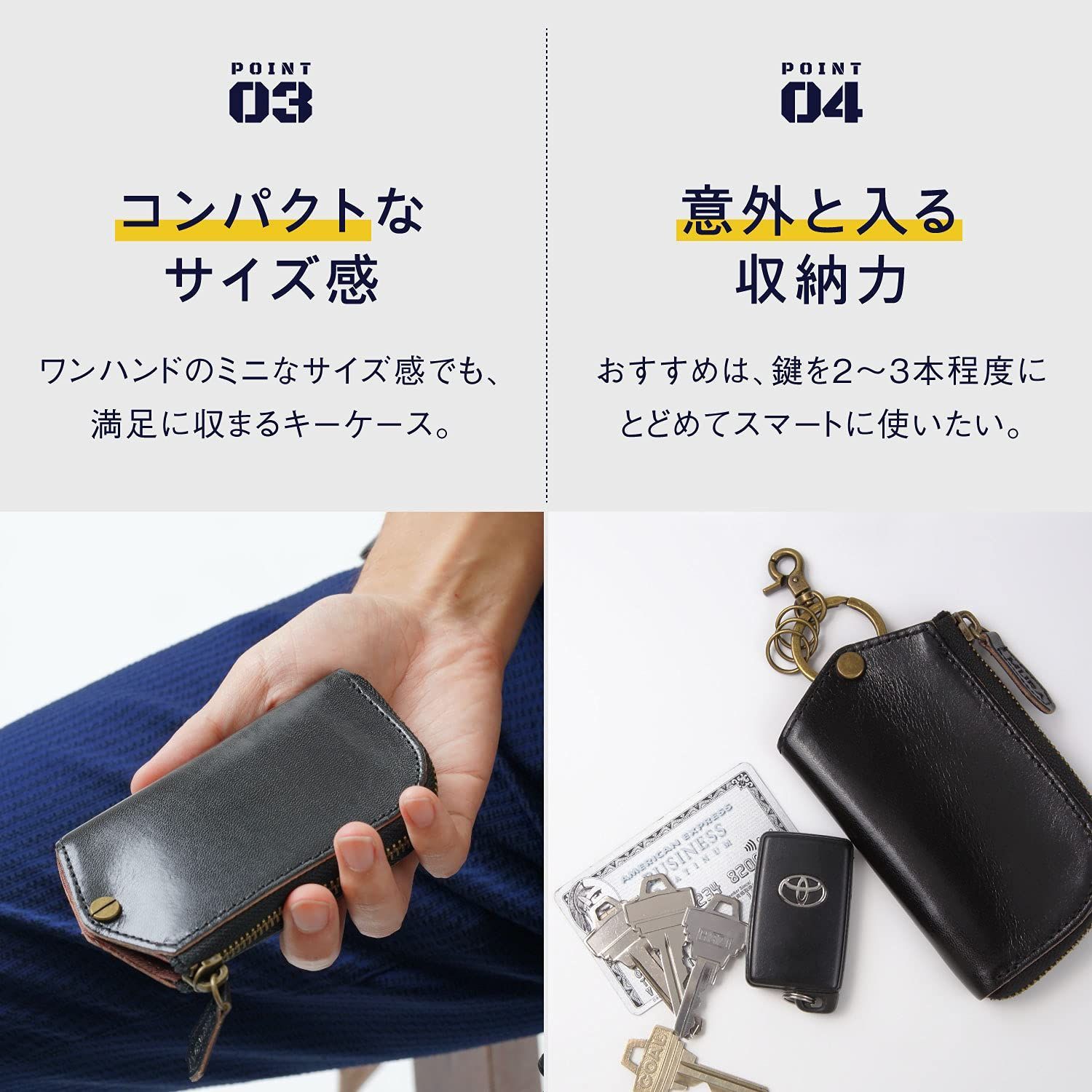 【片手でおさまるコンパクトサイズ】ワンハンドで収まるミニなサイズ感でお好みの鍵やスマートキー、カードキーまですべて収まります。