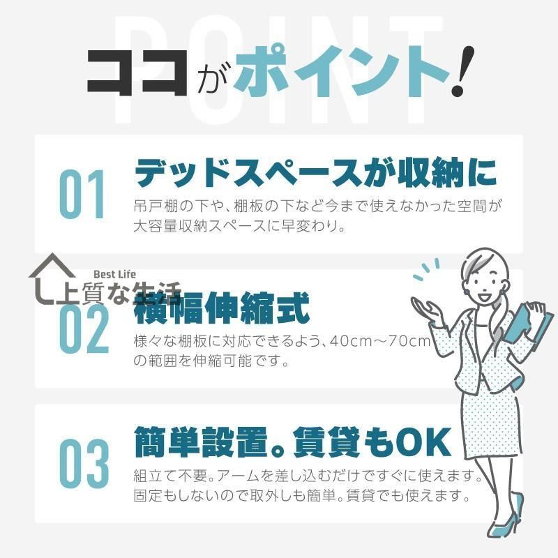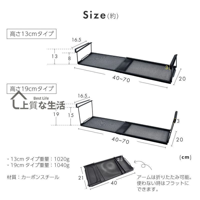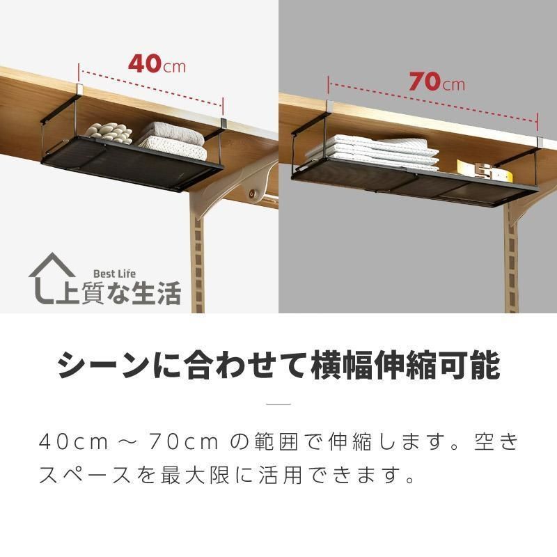 横幅は40cmから70cmまで伸縮可能で、収納量に応じて調整できます。