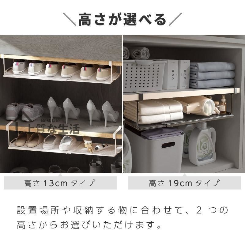 厚さ2.5cmまでの棚板に差し込むだけで、組み立てや工具が不要で簡単に設置できます。