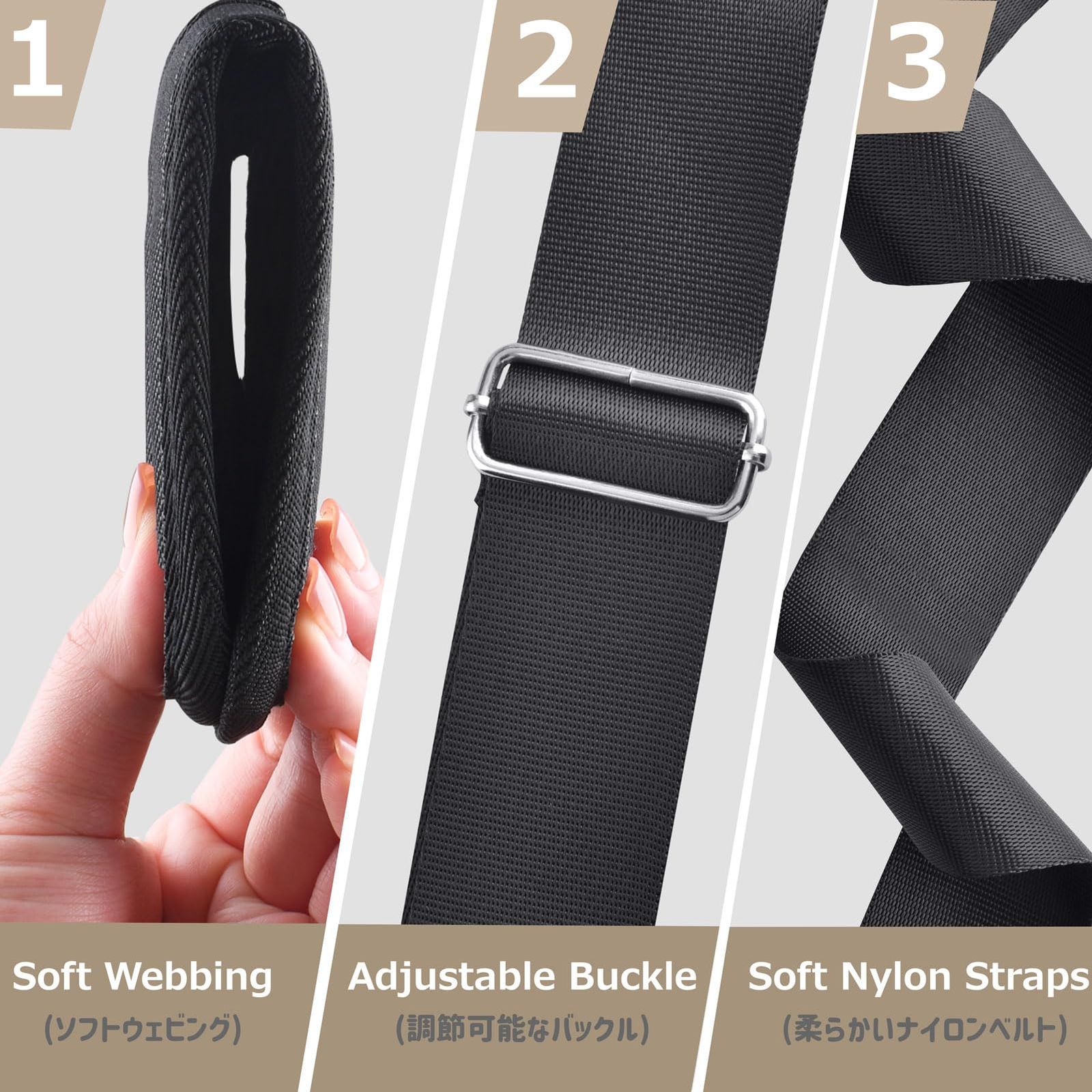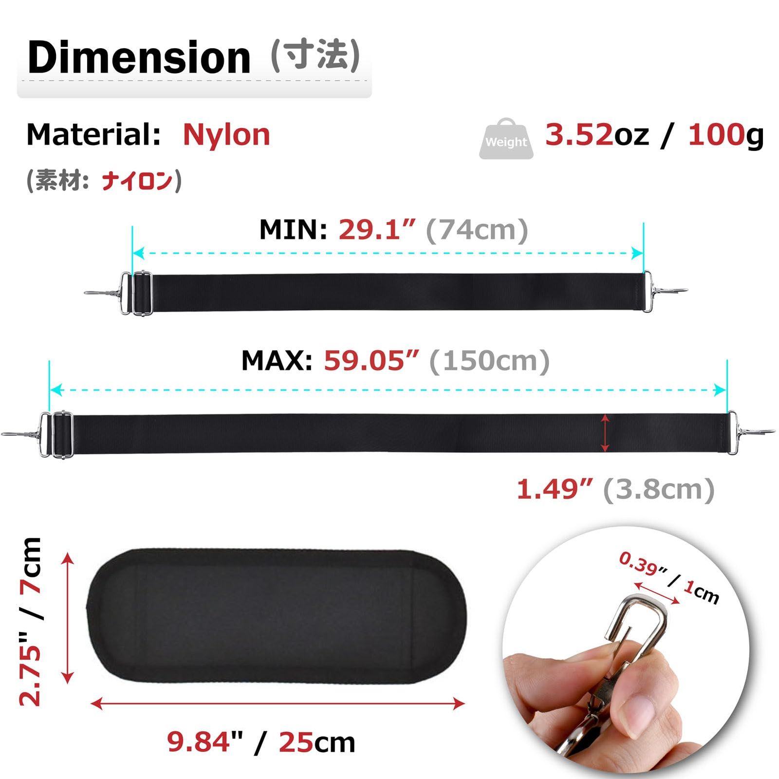?【サイズ】バッグ交換ベルトは軽量で重さはわずか100g、全長150cm、幅3.8cm、74~150cmまで調整可能です。肩パット全長25cm、幅8.7cm、肩に密着してフィットしやすいです