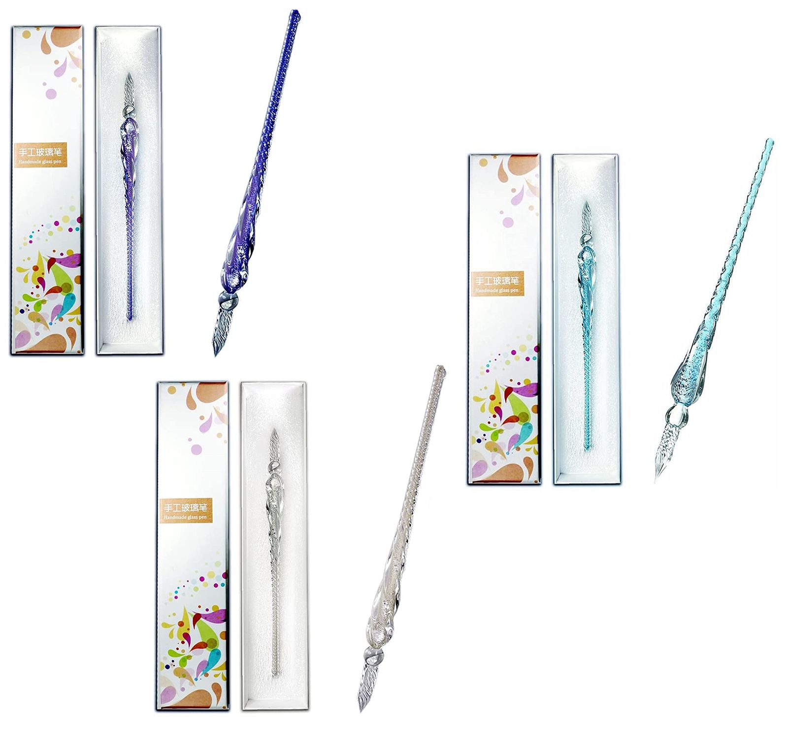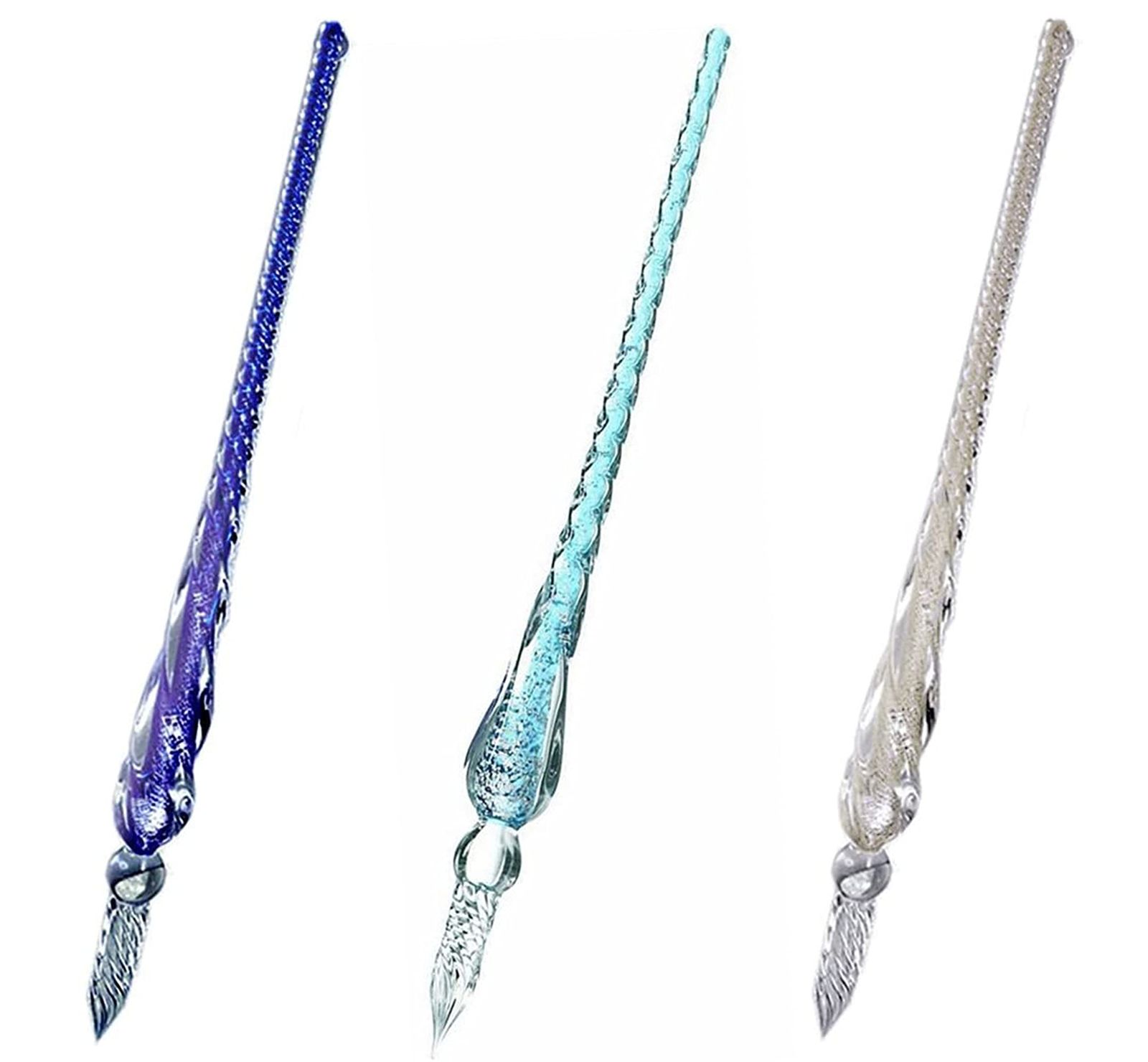 3本組 ねじり ガラスペン サインペン 万年筆 ペン 手紙 便箋 イラスト 透明 文房具 ボックス付き 3色で1本ずつ(パープル・スカイブルー・ホワイト)