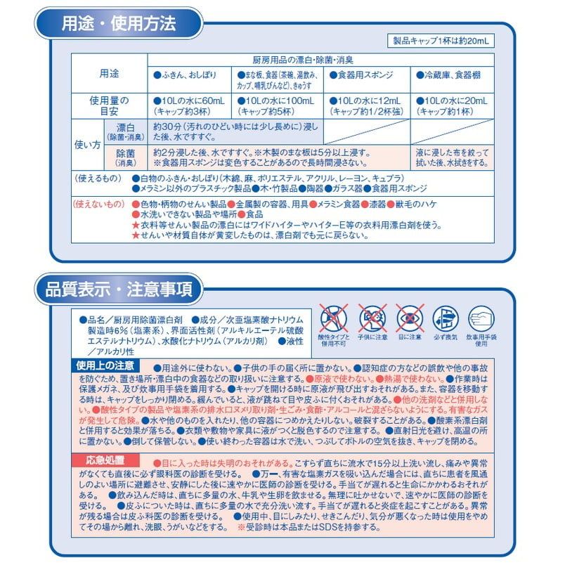●成分:次亜塩素酸ナトリウム製造時6%(塩素系)、界面活性剤(アルキルエーテル硫酸エステルナトリウム)、水酸化ナトリウム(アルカリ剤)