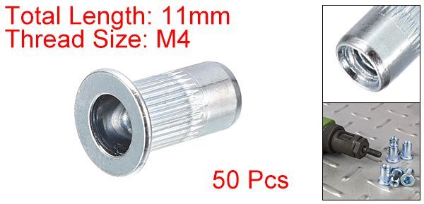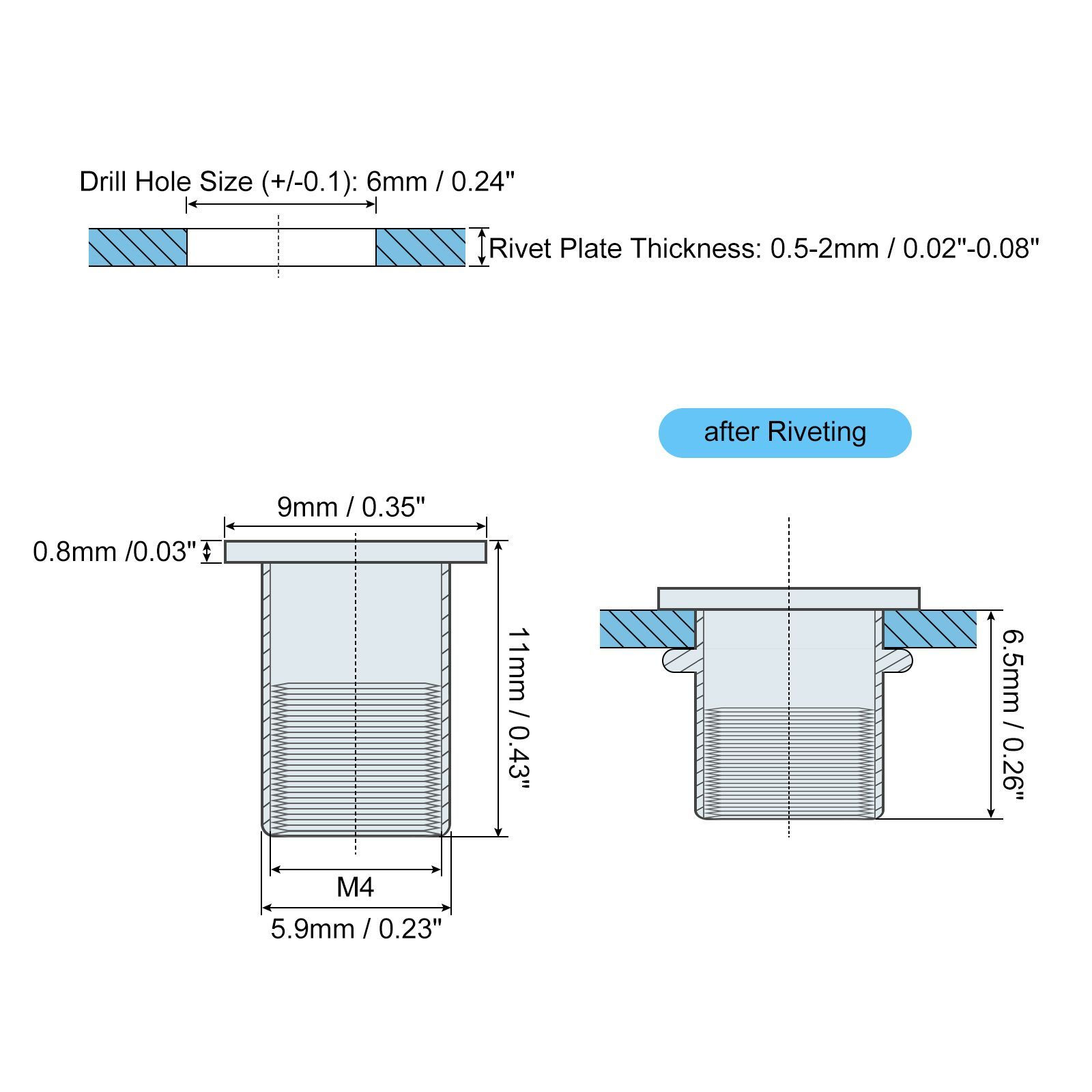 ねじサイズ: M4; ピッチ:0.7mm; 全長:11mm; 頭のサイズ: 9 x 0.8mm(D*T); 本体直径:5.9mm; 穴あけサイズ (+/-0.1): 6mm; リベット固定後の長さ: 6.5mm; リベットプレートの厚さ: 0.5-2mm
