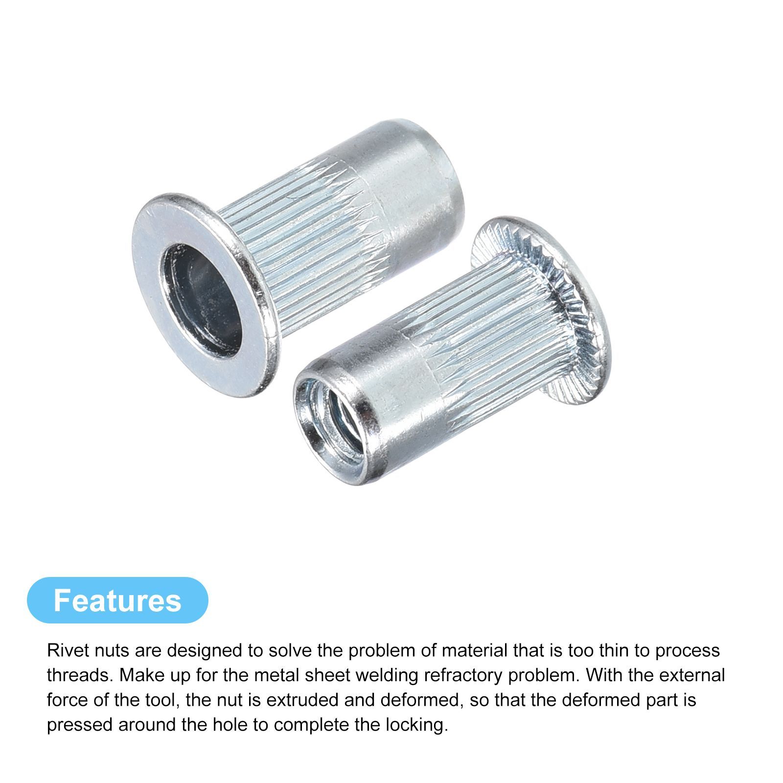 材質: これらのリベットナットは、高強度、優れた防錆性、耐食性、耐酸化性を備えた亜鉛メッキ炭素鋼素材で作られています。