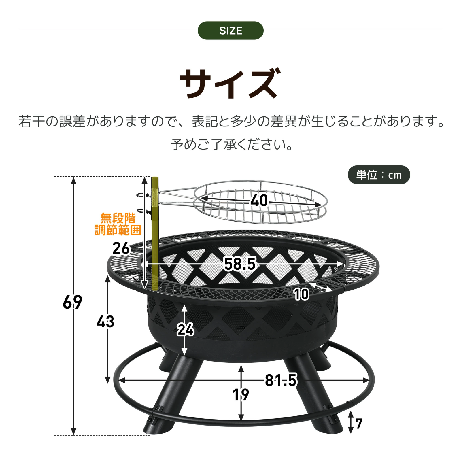 焼き網は40*40cmの大きなサイズで、一度にたくさんの食材を調理できます。8〜10人用に最適なサイズで、大人数でも安心して使えます。さらに、焼き網の高さを無段階で調整できるため、火力を自由にコントロールできます。食材を素早く冷ましたい場合は、焼き網を外側に移動させて、より効率的に調理ができます。
