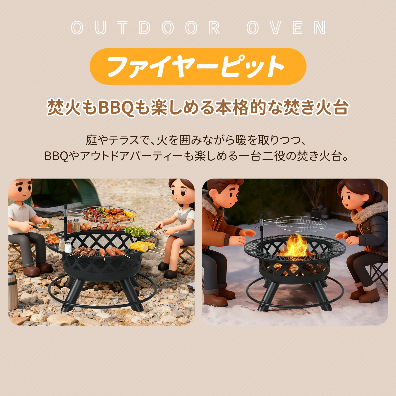 この焚き火台は、庭やテラスで火を囲みながら暖を取るだけでなく、BBQやアウトドアパーティーも楽しめる万能なアイテムです。焚き火として使うだけでなく、バーベキューにも適した設計になっており、一台で様々なアウトドア活動を楽しむことができます。