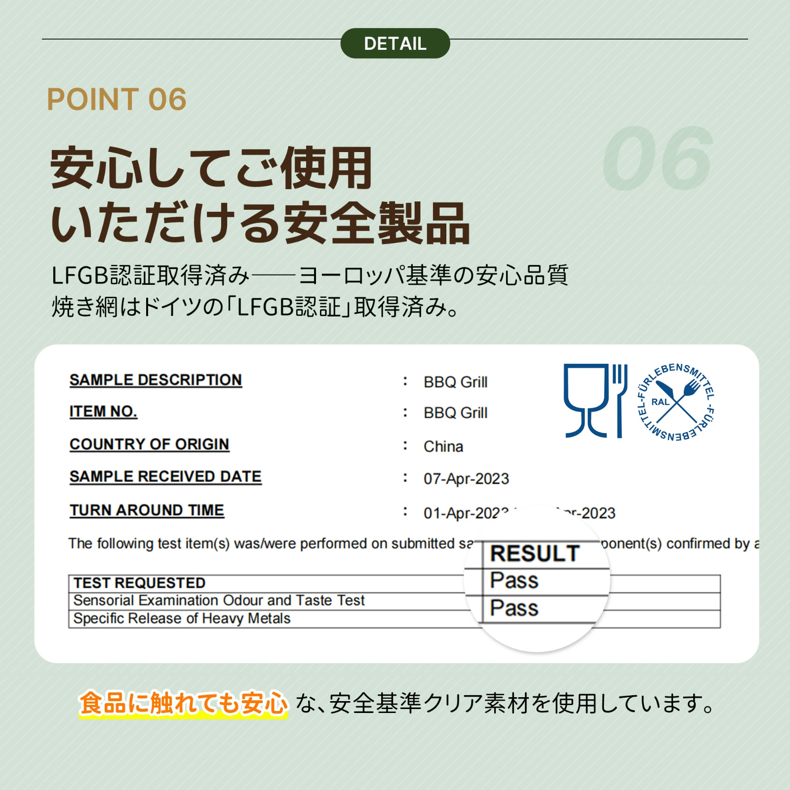 焼き網はヨーロッパ基準のLFGB認証を取得しており、食品に触れても安全な素材が使用されています。安全基準をクリアした製品であるため、安心して食材を調理することができます。