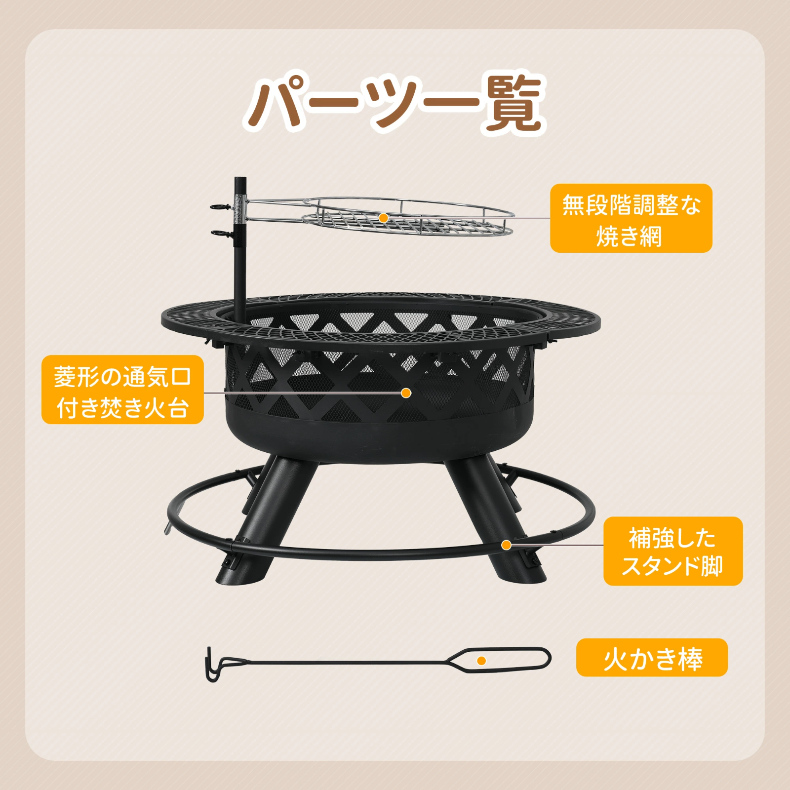 スタンドの脚は丸型の鉄製フレームでしっかりとつながれており、強度が増し、安定性も向上しています。これにより、強風や不安定な地面でも安心して使用でき、安心してアウトドアを楽しむことができます。また、付属の火かき棒を使えば、火の調整を安全に行うことができます。簡単に設置でき、すぐにアウトドア活動を楽しめるので、手軽に使用できます。