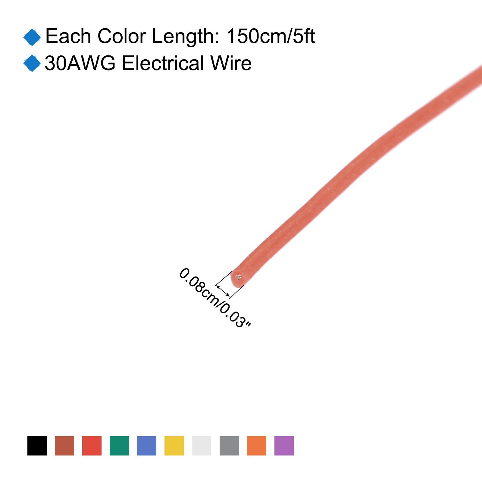 パッケージ内容:電気PVCワイヤー1セット;10色:黒、赤、白、青、緑、黄、オレンジ、グレー、茶、紫;各色の長さ:1.5m/5ft;外径:0.08cm/0.03";スタイル:マルチストランドワイヤーの1コア;絶縁材料:PVC;導体材料:チンメッキ銅;定格電圧:300V;高温耐性:80℃/176?