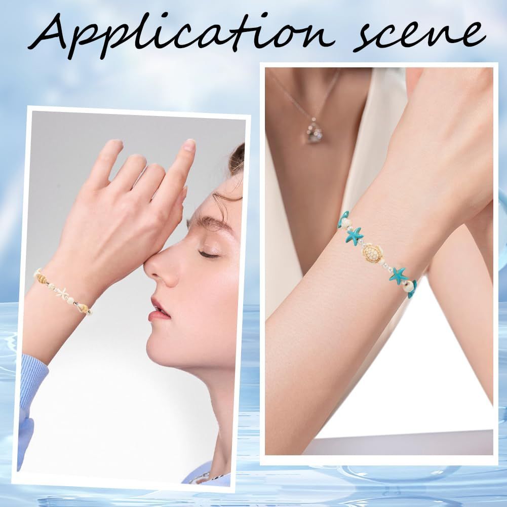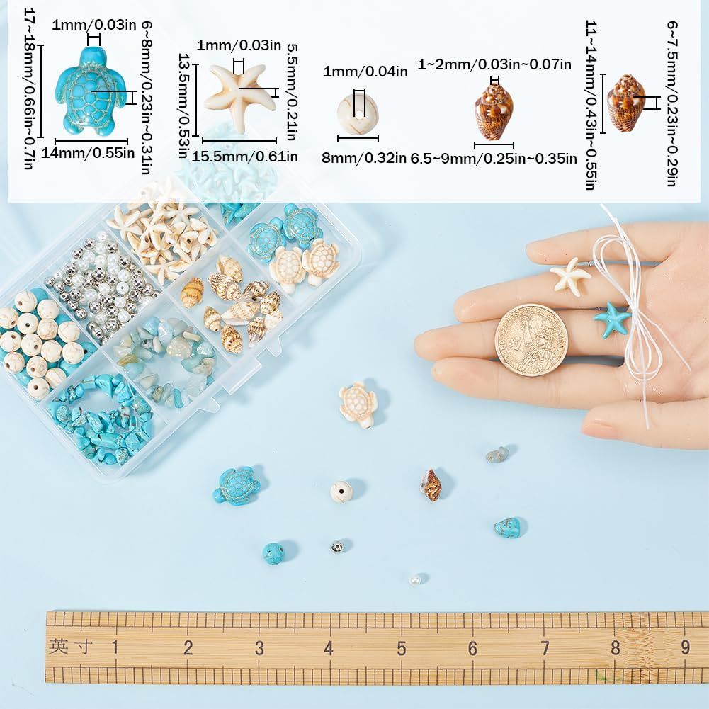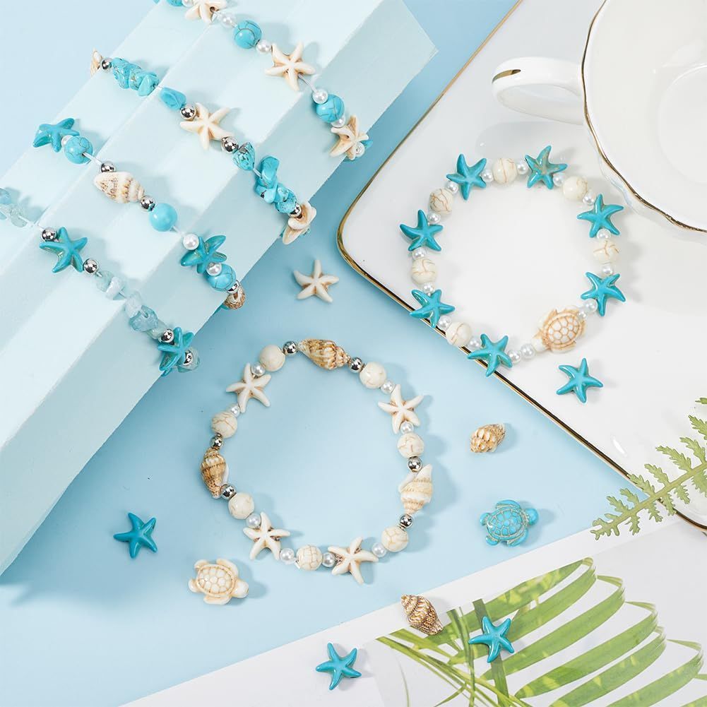 プレミアム素材:丸い石ビーズ タートルビーズとヒトデビーズはターコイズビーズで作られています 模造真珠ビーズはガラスで作られています 銀色のビーズはプラスチックで作られています シェルビーズは天然の貝殻で作られています.