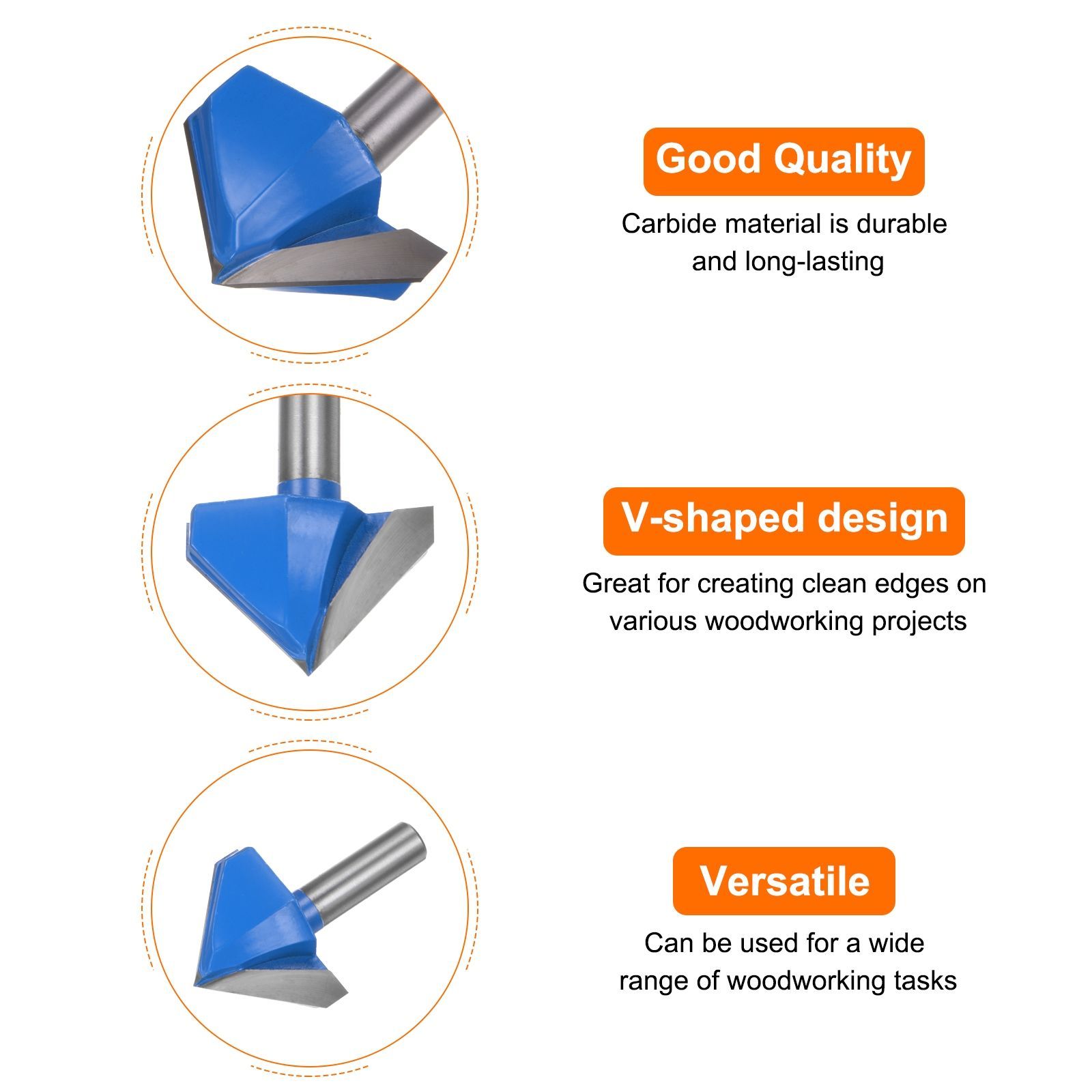 特徴 - 90度のV型エンドミルデザインは鋭くクリーンな切れ味を提供し、木工、大工、彫刻、エッジトリミング、切断作業に最適です。
