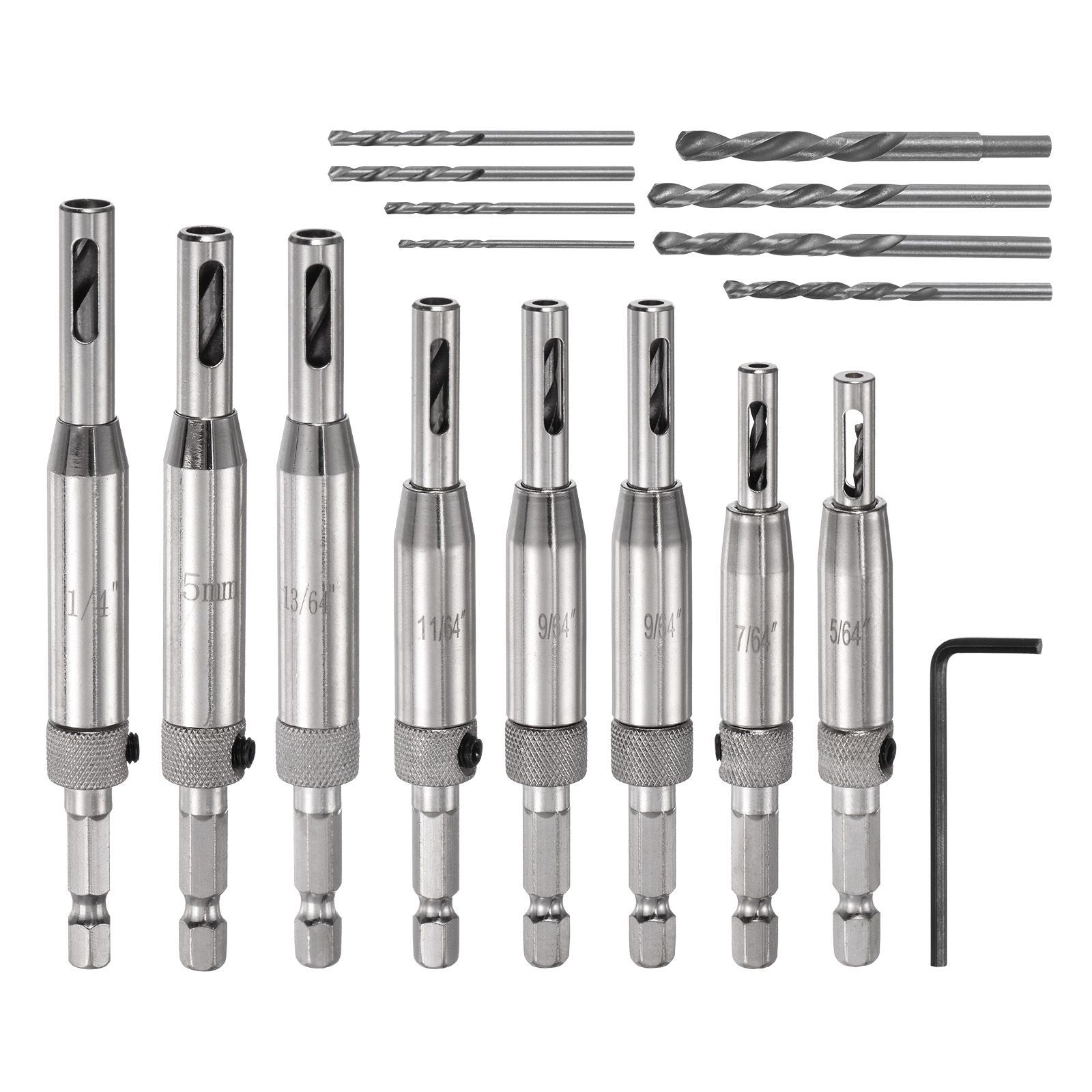 サイズ - セルフセンタリングドリルビットには、5mm、7/64"、13/64"、5/64"、9/64"、11/64"、1/4"、9/64"の中心ビット、57mm/59mm/69mm/59mm/74mm/85mm/85mm/80mmの中心ビット長、1/4"(6.35mm)のヘックスシャンク、全長88mm/91mm/100mm/100mm/109mm/113mm/100mm/109mmが含まれています。