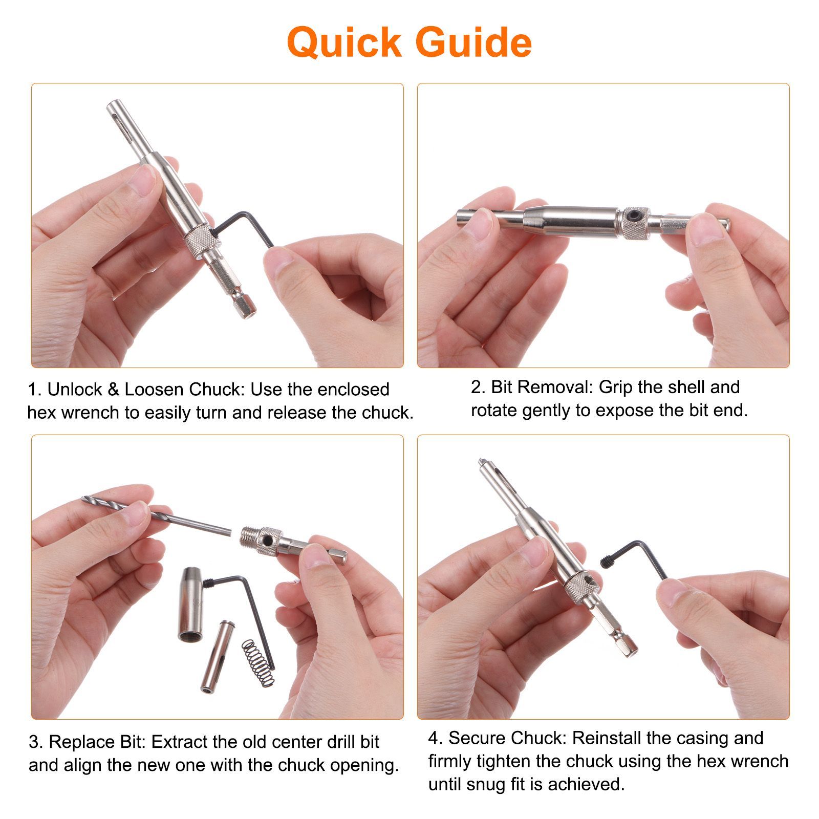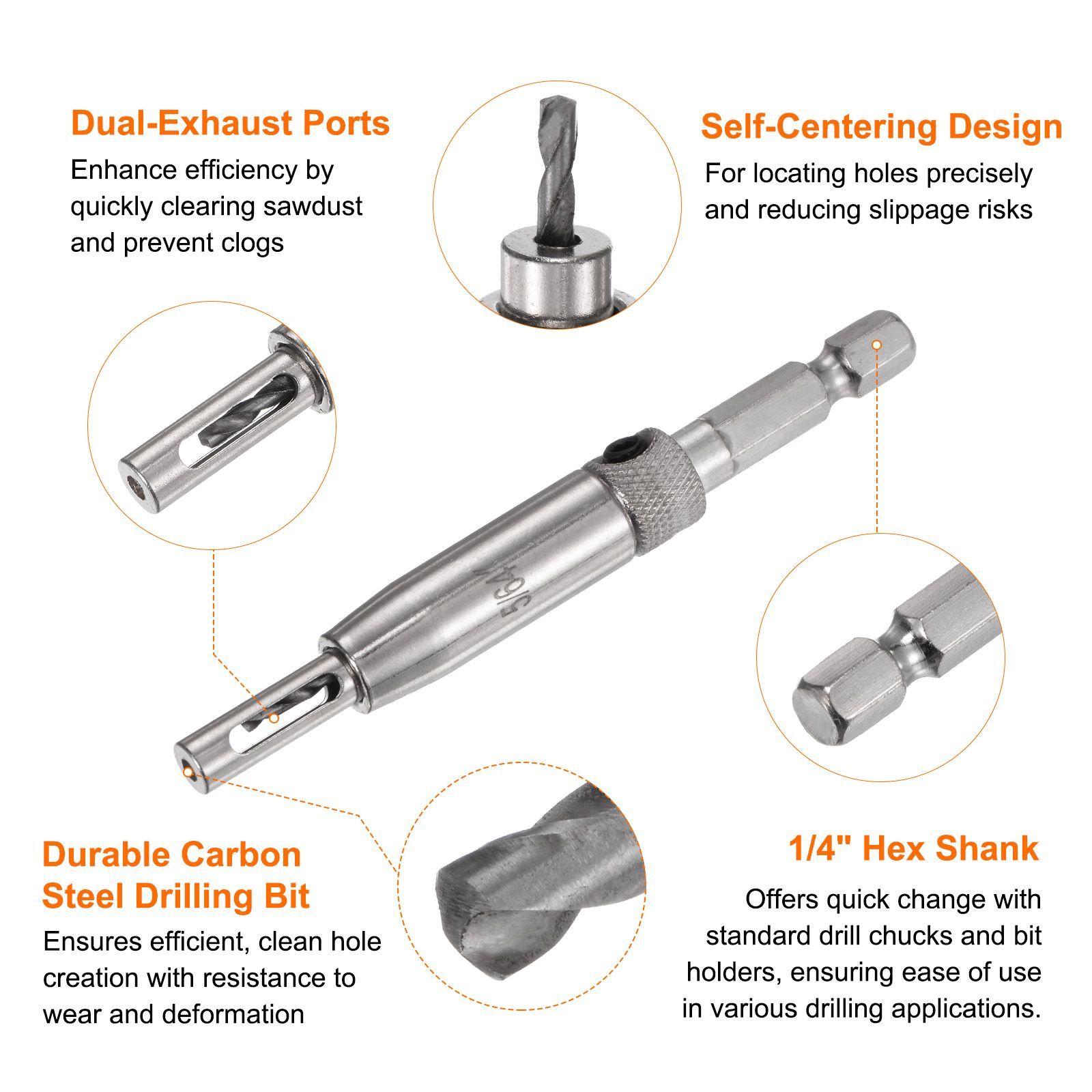 特徴 - セルフセンタリング設計は、正確な穴の位置決めを確実にし、また、安定性を確保し、滑りのリスクを軽減します。センタリングドリルビットは、デュアル排気口を通じて迅速に木くずを除去し、詰まりを防ぐことで効率を向上させます。セルフセンタリングパンチセットには、簡単なセットアップと調整のための六角キーが付属しており、再チャックすることなくビットを交換できます。