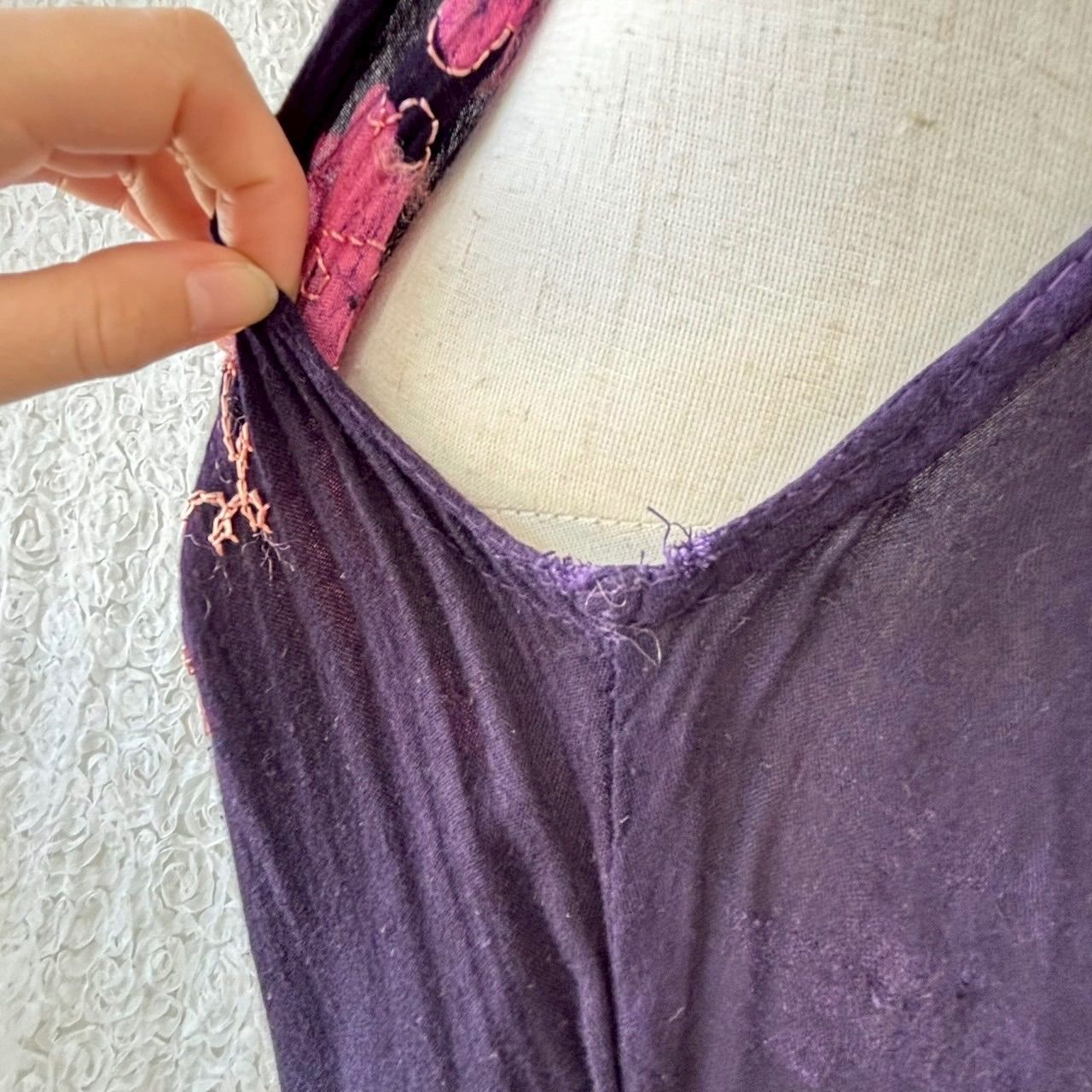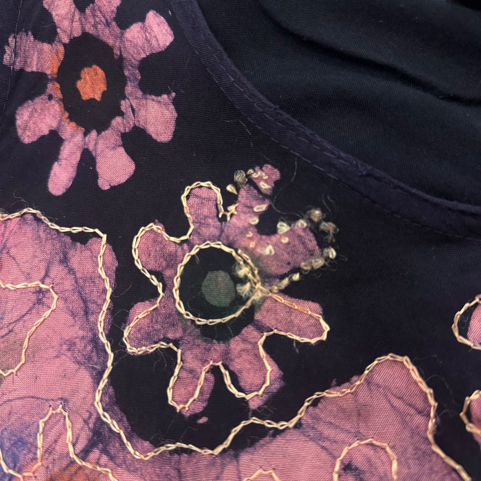 胸元の大ぶりなフラワーモチーフとハンドクラフト調のデザインが目を惹く一枚です。