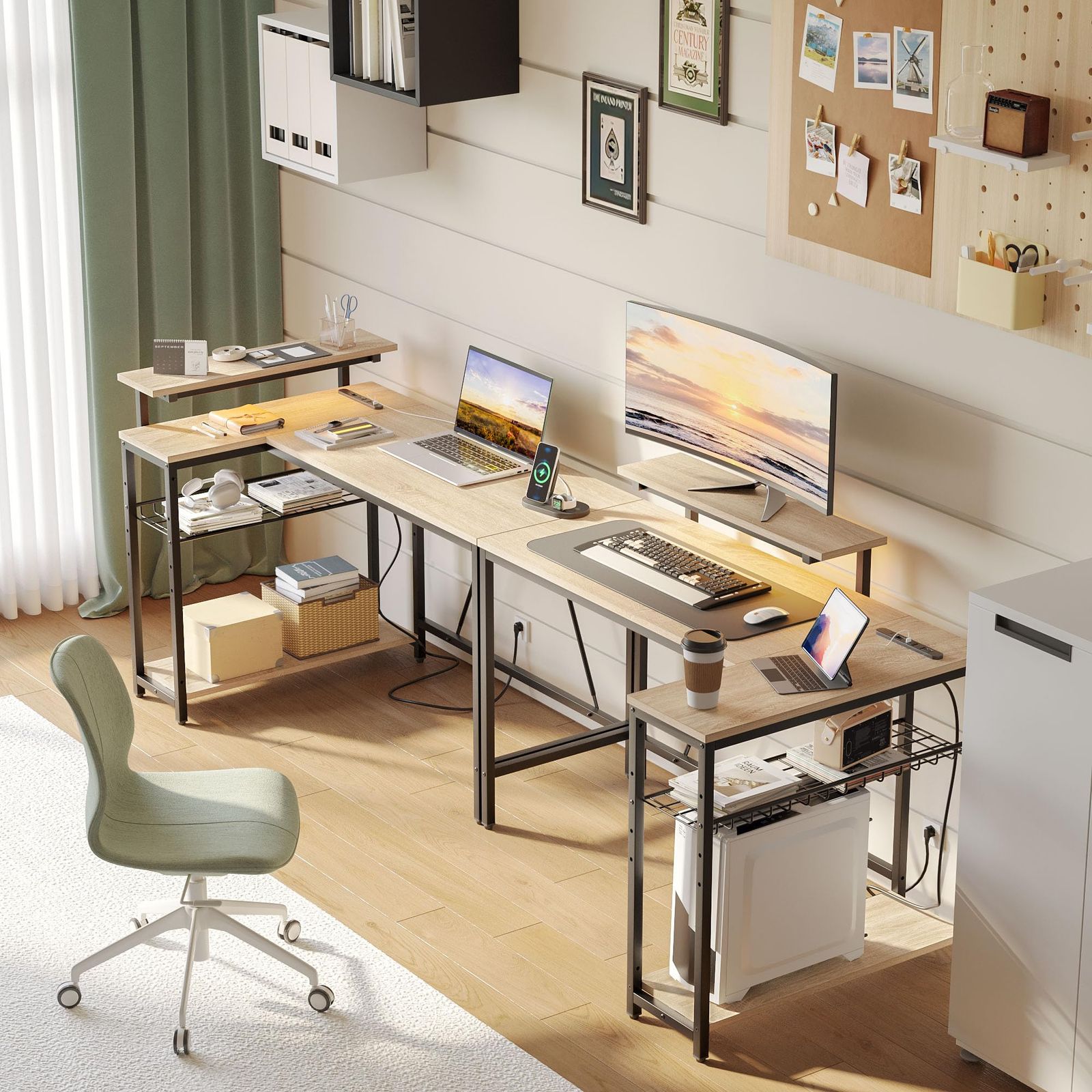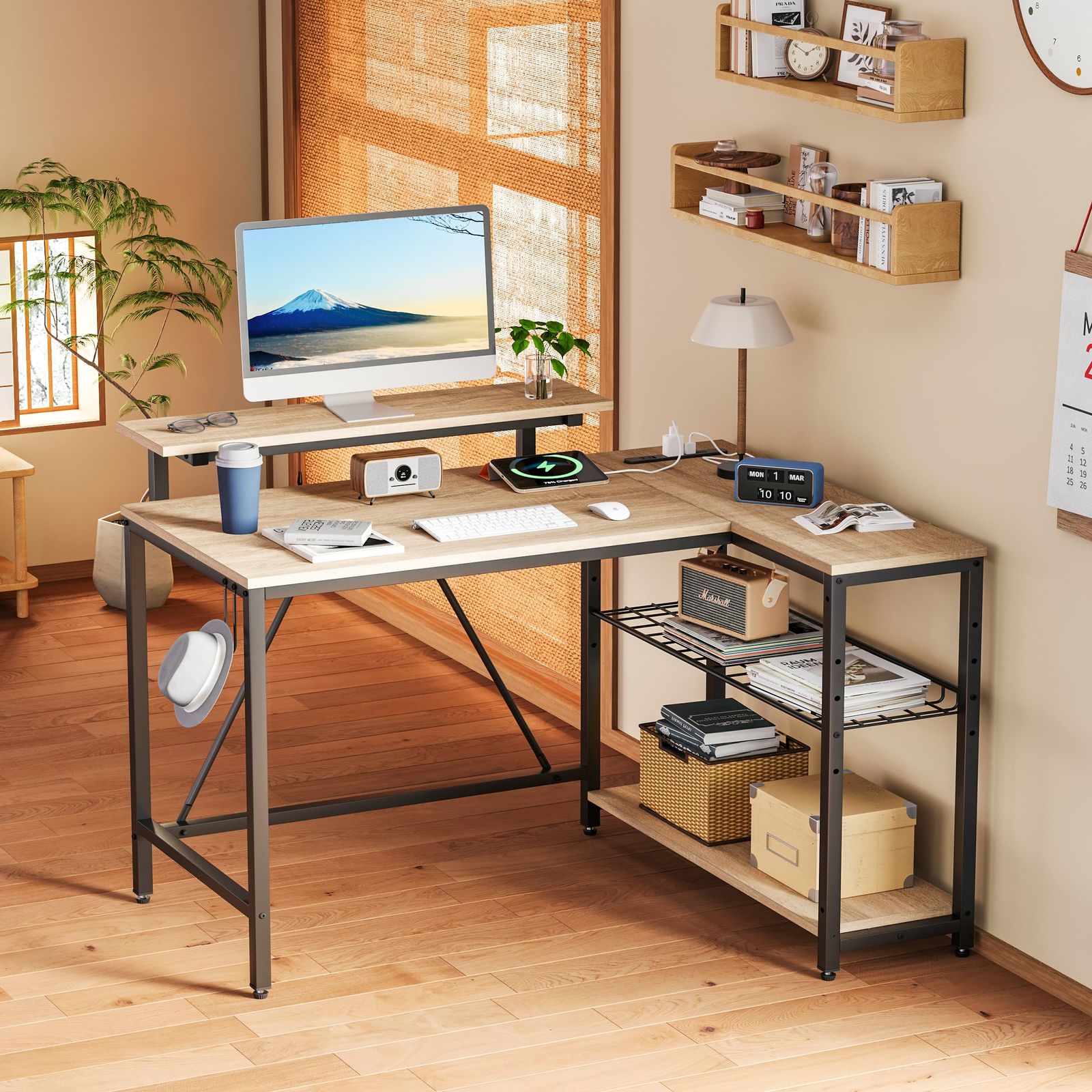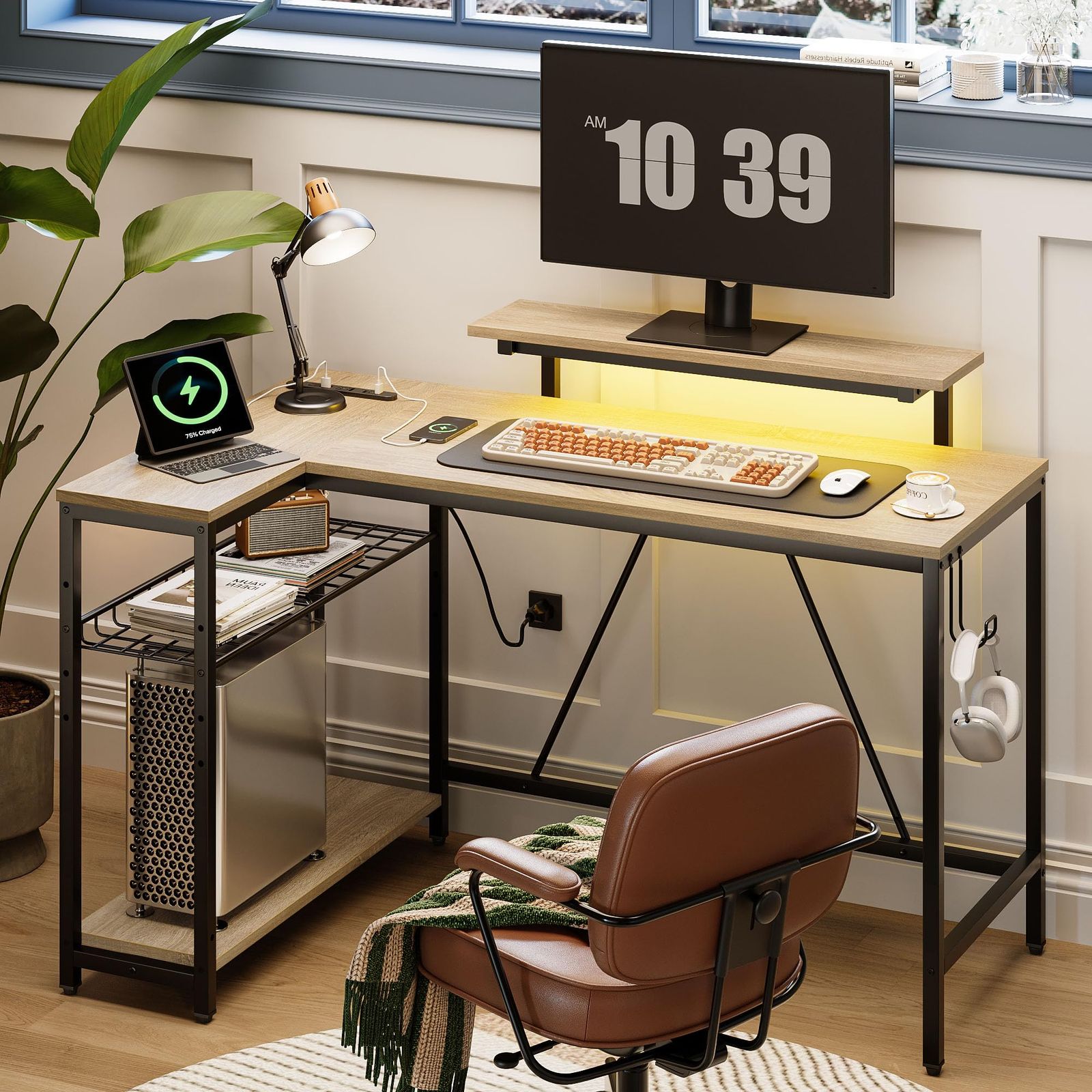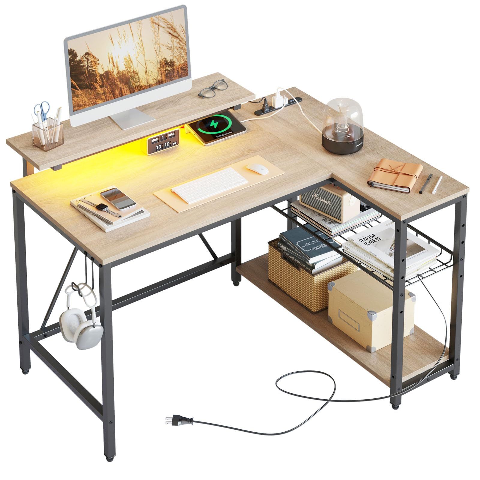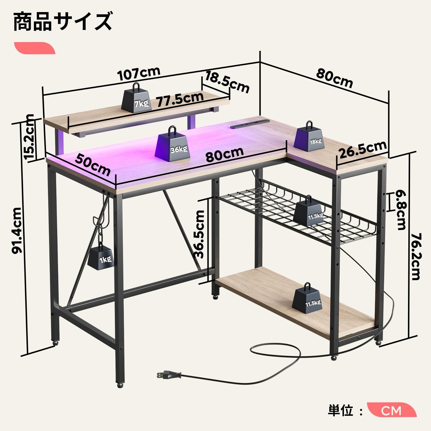 Bestier l字デスク パソコンデスク L字 幅107cm コンセント&モニター台付き ゲーミングデスク LED付き 机 pcデスク ラック付き 左右組み換え可能 棚高さ調節可能 勉強机 L字型 リモートワーク ゲーム 書斎 おしゃれ オーク