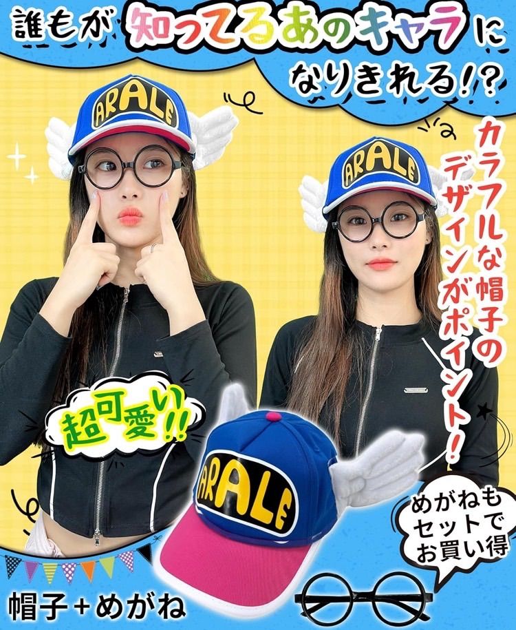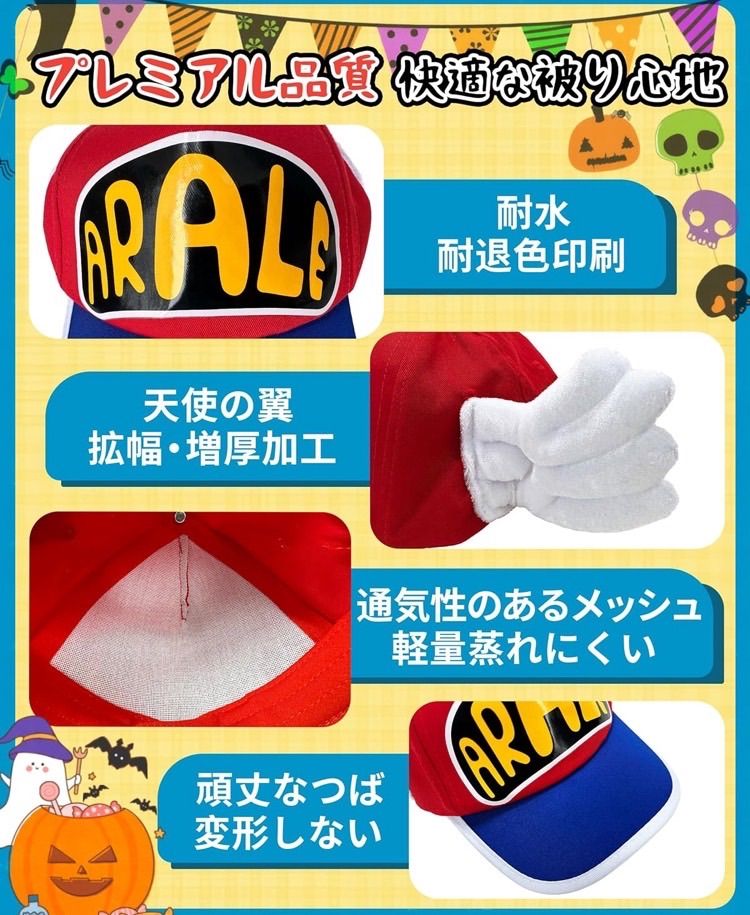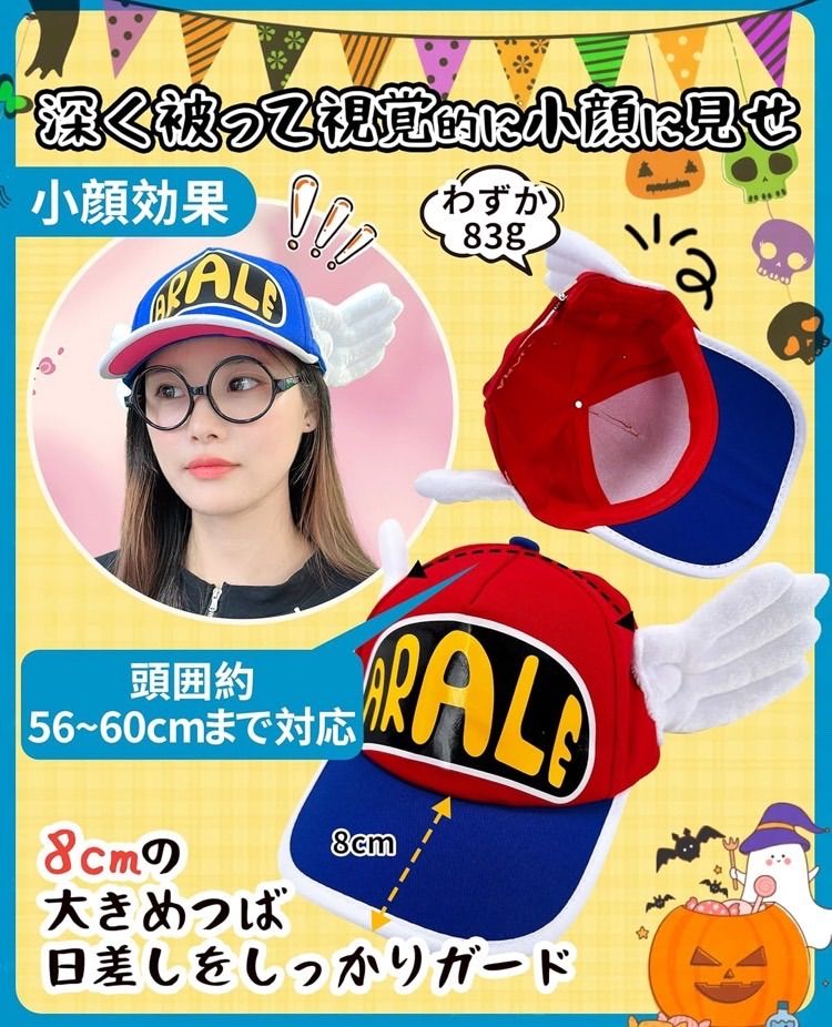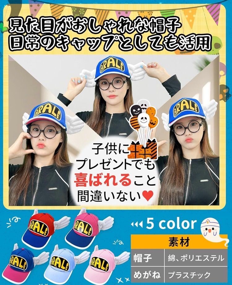 ✅【アラレちゃん帽子のコスプレ・セット内容】帽子、メガネフレーム、ハロウィン専用蓄光タトゥーシール×1枚 ★帽子/綿、ポリエステル、メガネフレーム/プラスチック カラフルな帽子のデザインがポイント!メガネもセットでお買い得です。 ★★ギフト:1枚のハロウィン専用蓄光タトゥーシールをワンセットでお届け致します。※ハロウィン蛍光タトゥーシールの色はランダムに配っていますが、ご理解ありがとうございます。