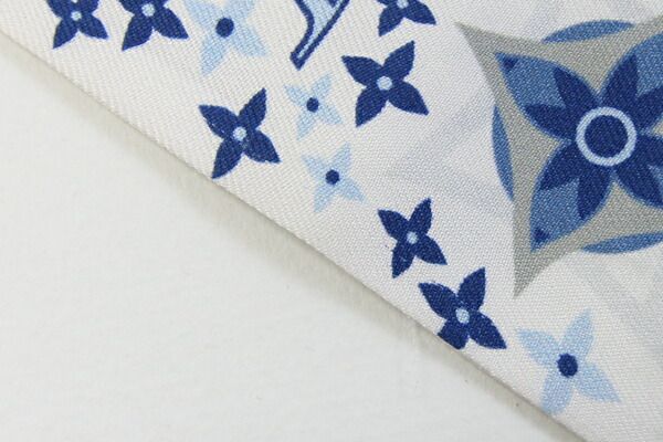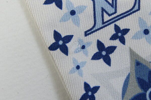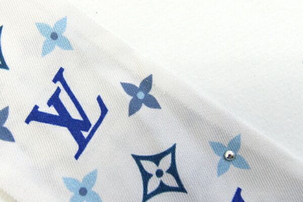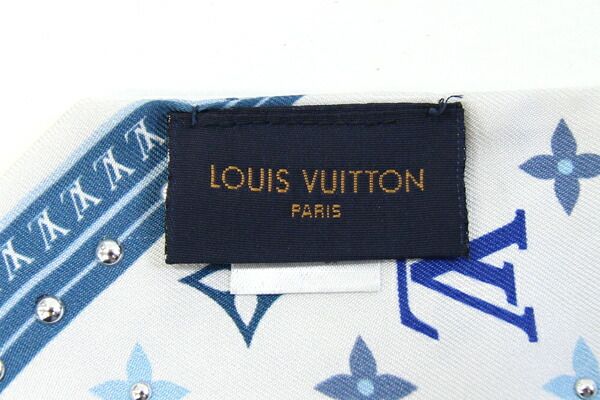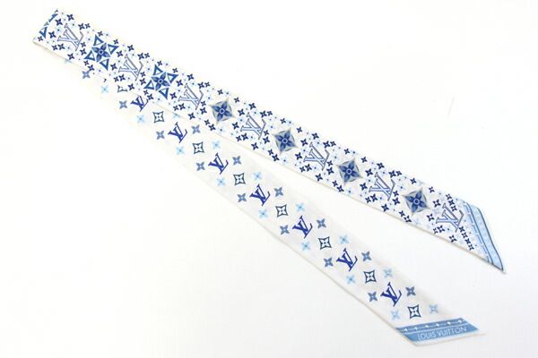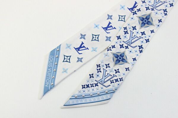 ルイヴィトンスカーフバンドーBBスタッズM77828ホワイトライトブルーシルク100%中古リボンスカーフバッグアクセサリーファッションモノグラムLOUISVUITTON