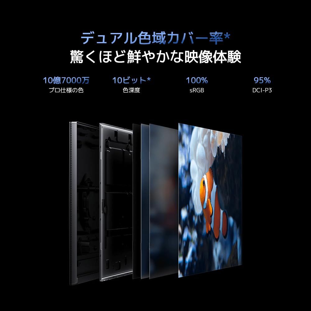 【デュアル色域カバー率】10億7000万色もの豊かな色表現により、奥行きのある描写と滑らかなグラデーションを実現します。デュアルの広色域カバーにより、プロフェッショナルなニーズにも応える美しい色彩を提供します。