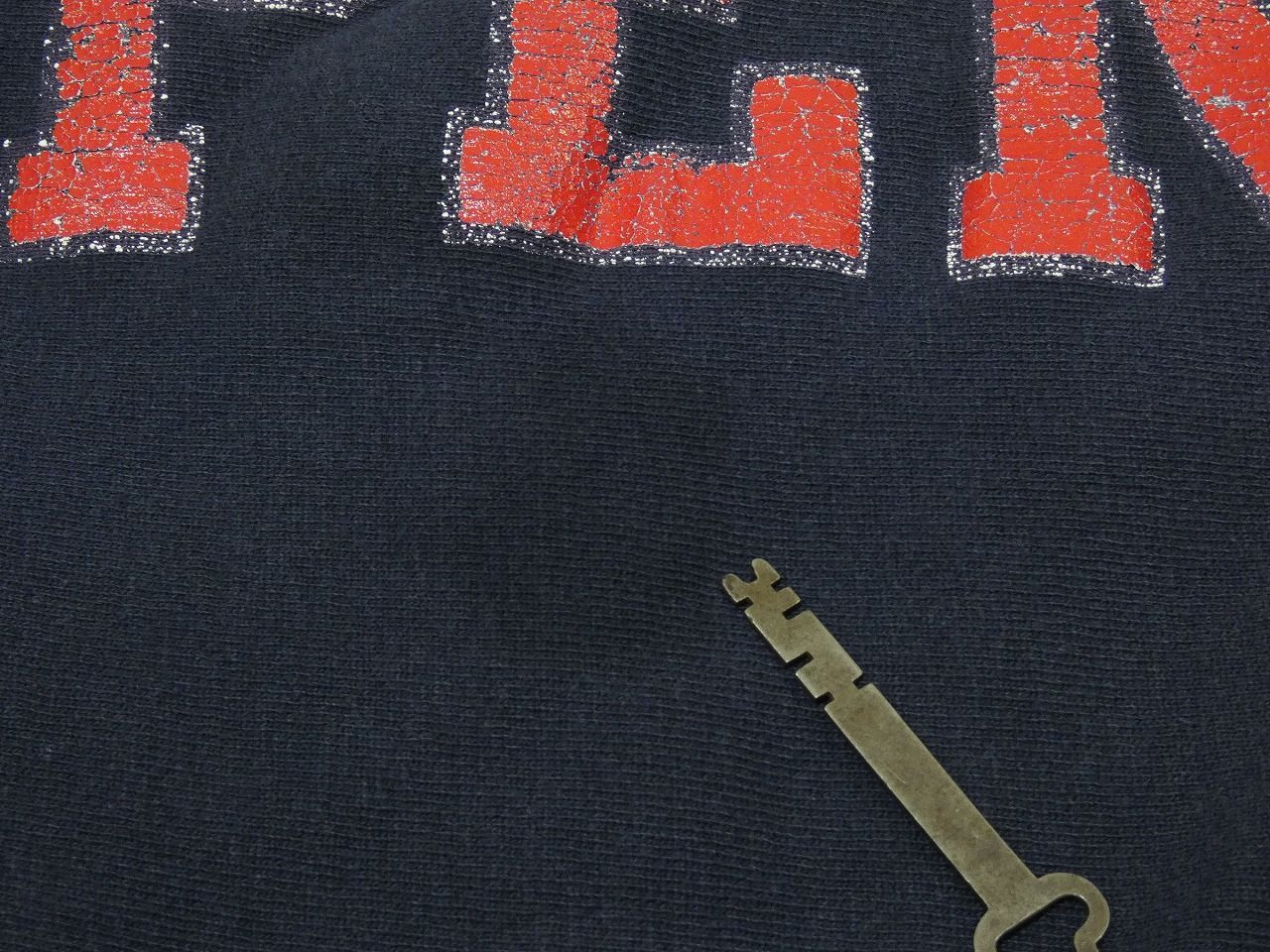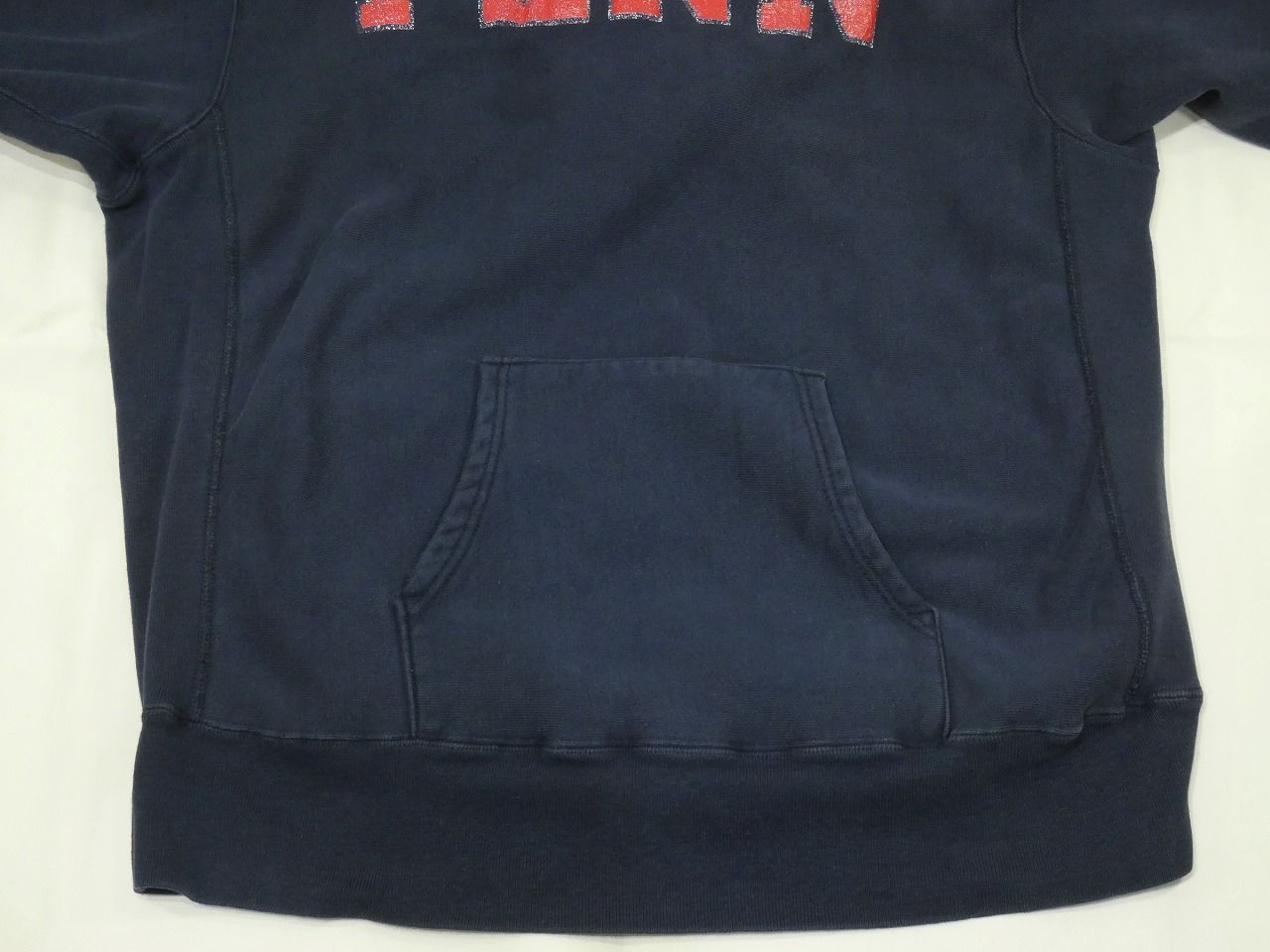PENNはペンシルベニア大学の略称で、アイビーリーグに所属し、全米でも屈指の難関校です。そんなこちらは、スクールカラーでもあるネイビーベースにレッドのPENNの文字が入ります。70sの単色物に比べ、フードが大きく実用的なのもこの時代頃からかと思います。襟繰りやリブにスレキズなども無く、サイズ、コンディション共に最高です。お探しだった方は是非、ご検討下さい。
