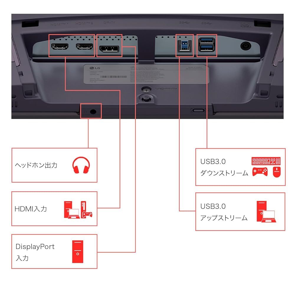 出入力端子:HDMI入力×2 (Ver 2.1)、DisplayPort入力 (Ver 1.4)、USBアップストリーム(USB 3.0)、USBダウンストリーム(USB 3.0)×2、ヘッドホン(ステレオミニジャック)、USB Type-C™出力