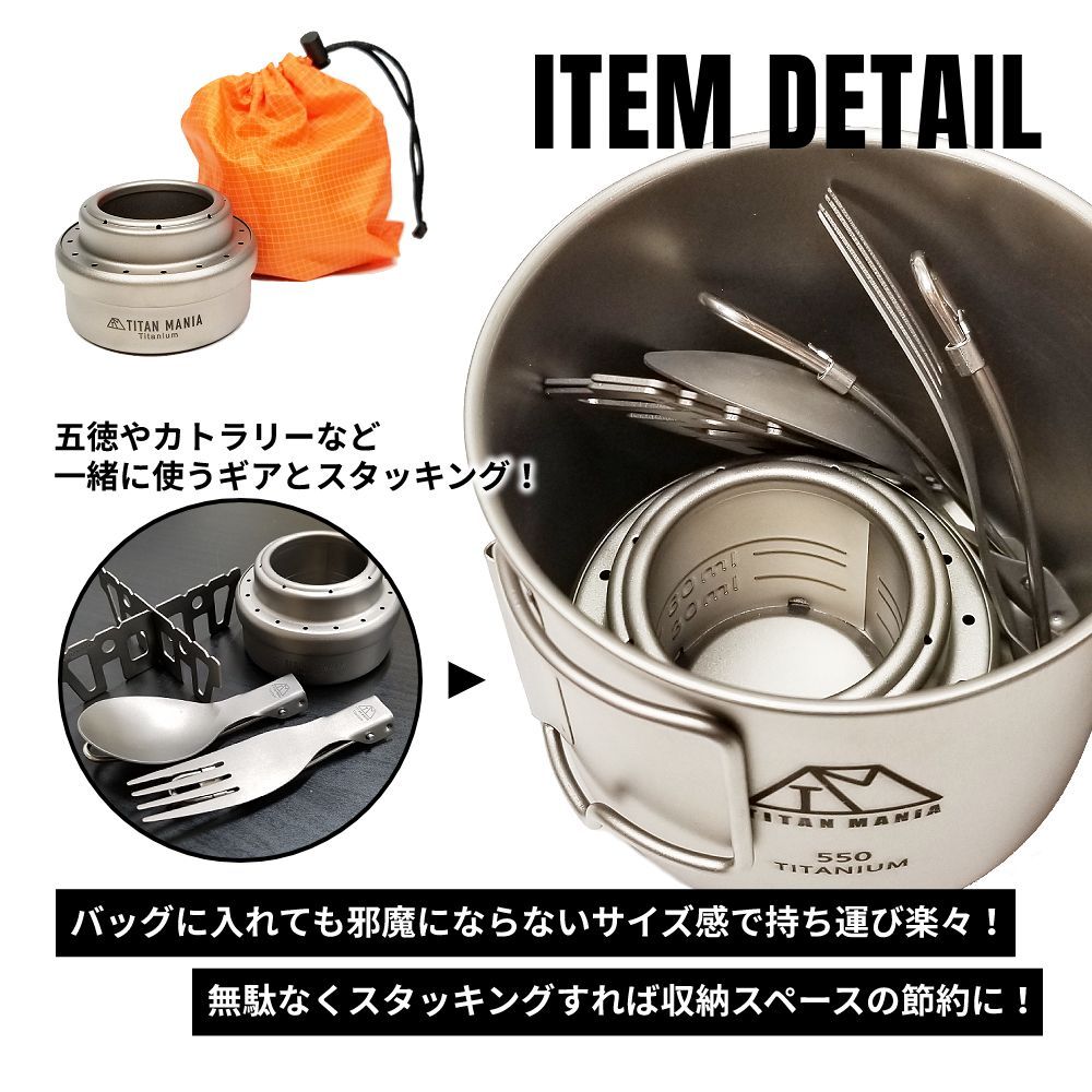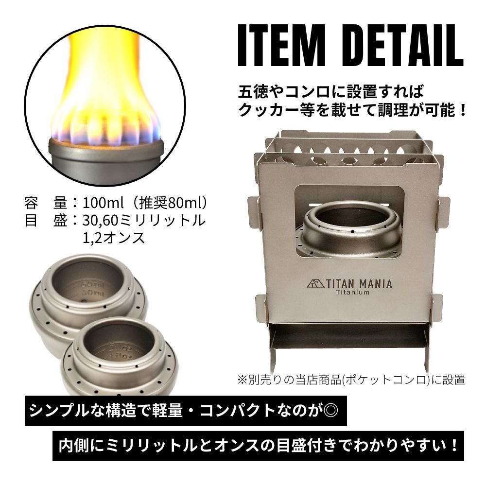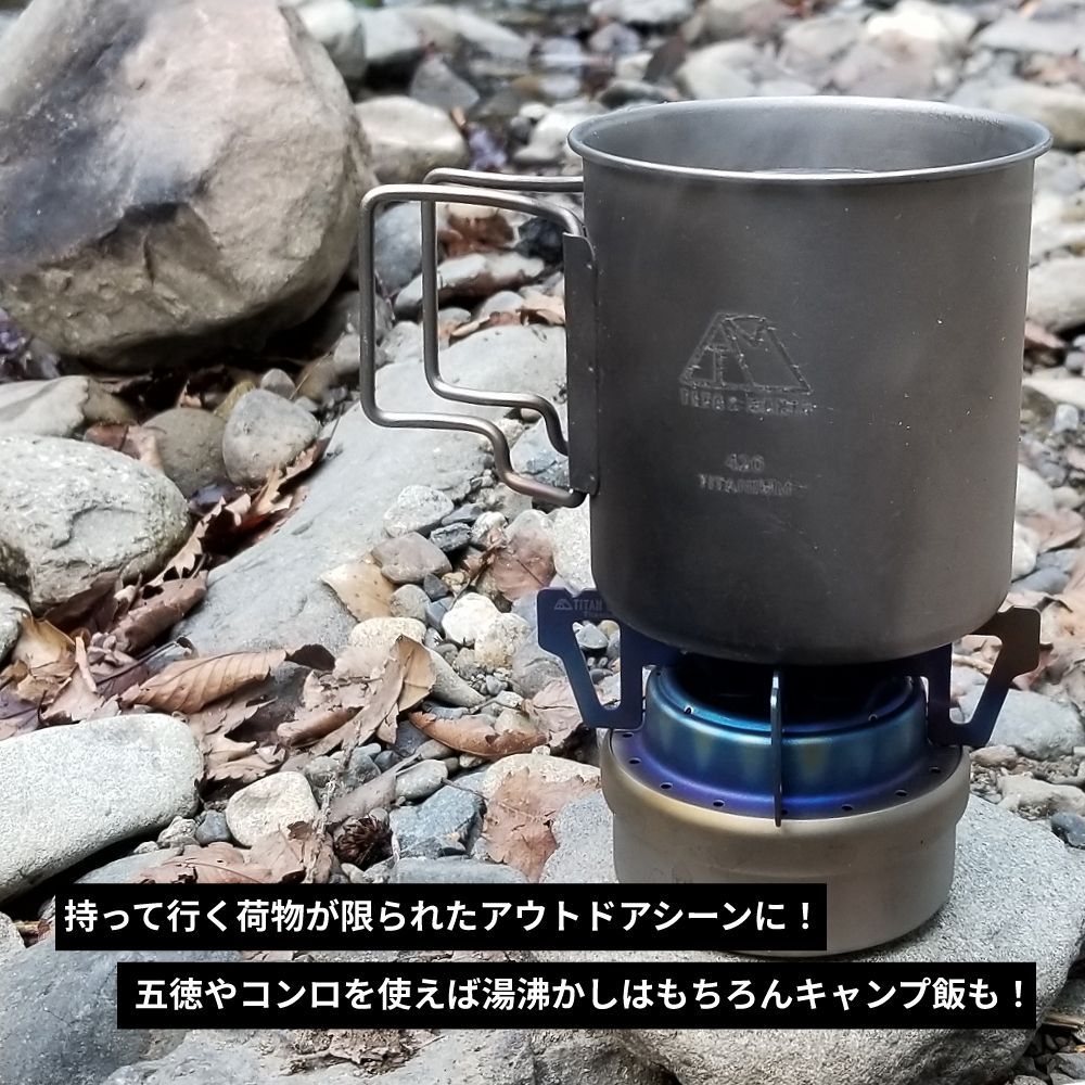 軽量!頑丈!錆びにくい!ソロキャンプやBBQなどアウトドアで一つは持っておきたいチタン製アルコールストーブ。開口部から注いだ燃料用アルコールを効率よく燃焼させる事ができる! 別売りの五徳を設置すると安定してクッカーを載せることができるので、湯沸かしはもちろん調理することもできます!バイクツーリング、登山や釣りなど様々なアウトドアシーンで、調理や暖を取るの大活躍!