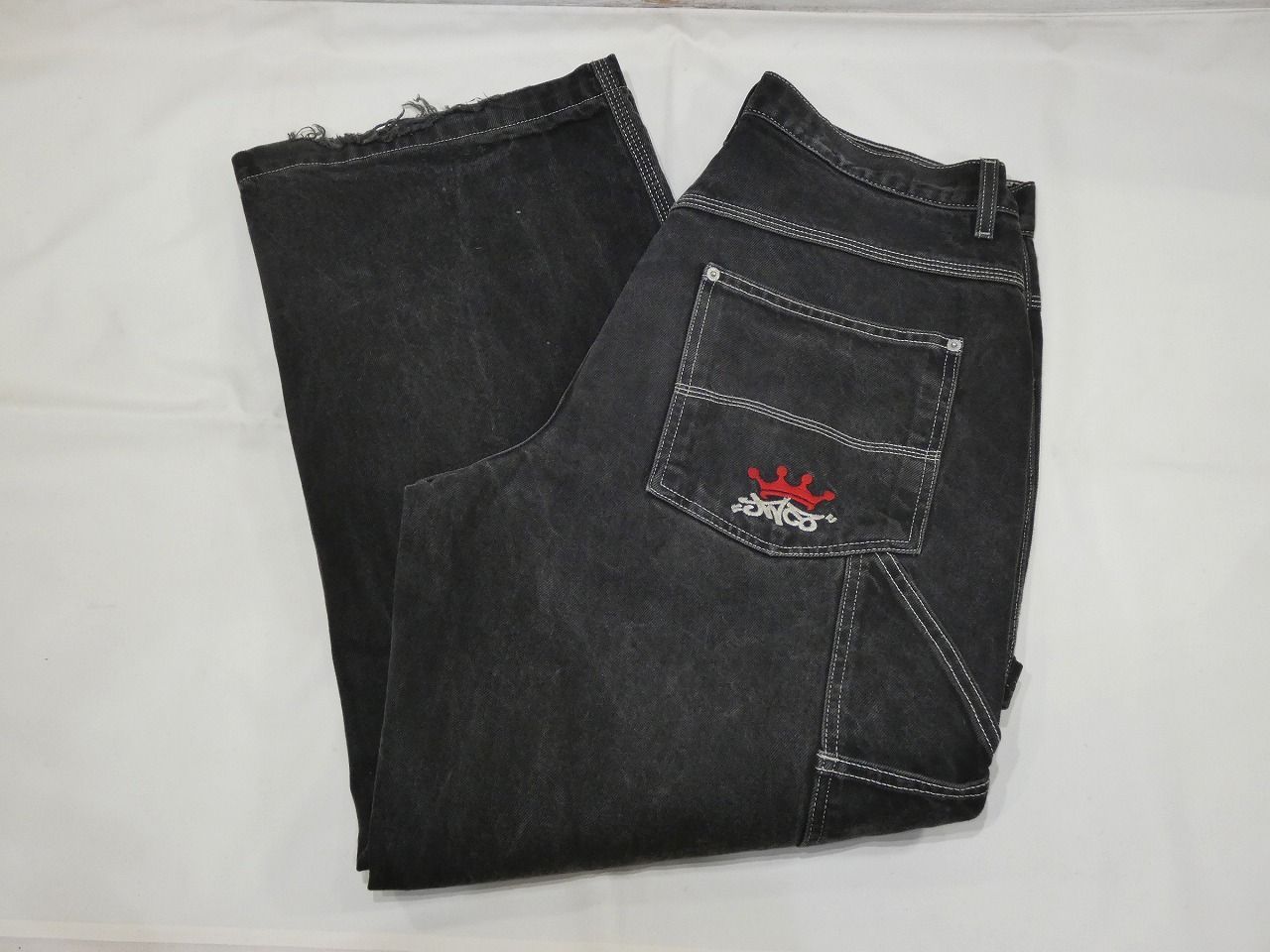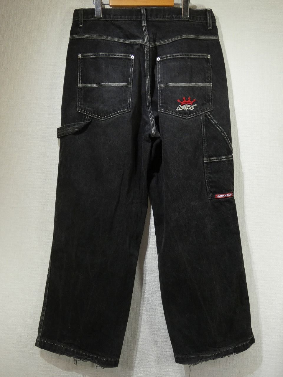 JNCO JEANSは1985年にカリフォルニアで創業したストリートブランドで、JNCOは(Judge None Choice One)の略語です。そんなこちらは、お探しの方も多いオールド ジンコで、LOOSE FITやBAGGYなどに比べてさらに太いドカン ストレート デザインになります。合わせやすいブラックというのも嬉しいポイントです。Y2Kスタイルやスケーター、HIP HOPにレイブ系ファッションに相性抜群です。ウエストはやや大きめですが絞って穿くとさらに太さが強調されるかと思います。お探しだった方は是非、ご検討下さい。