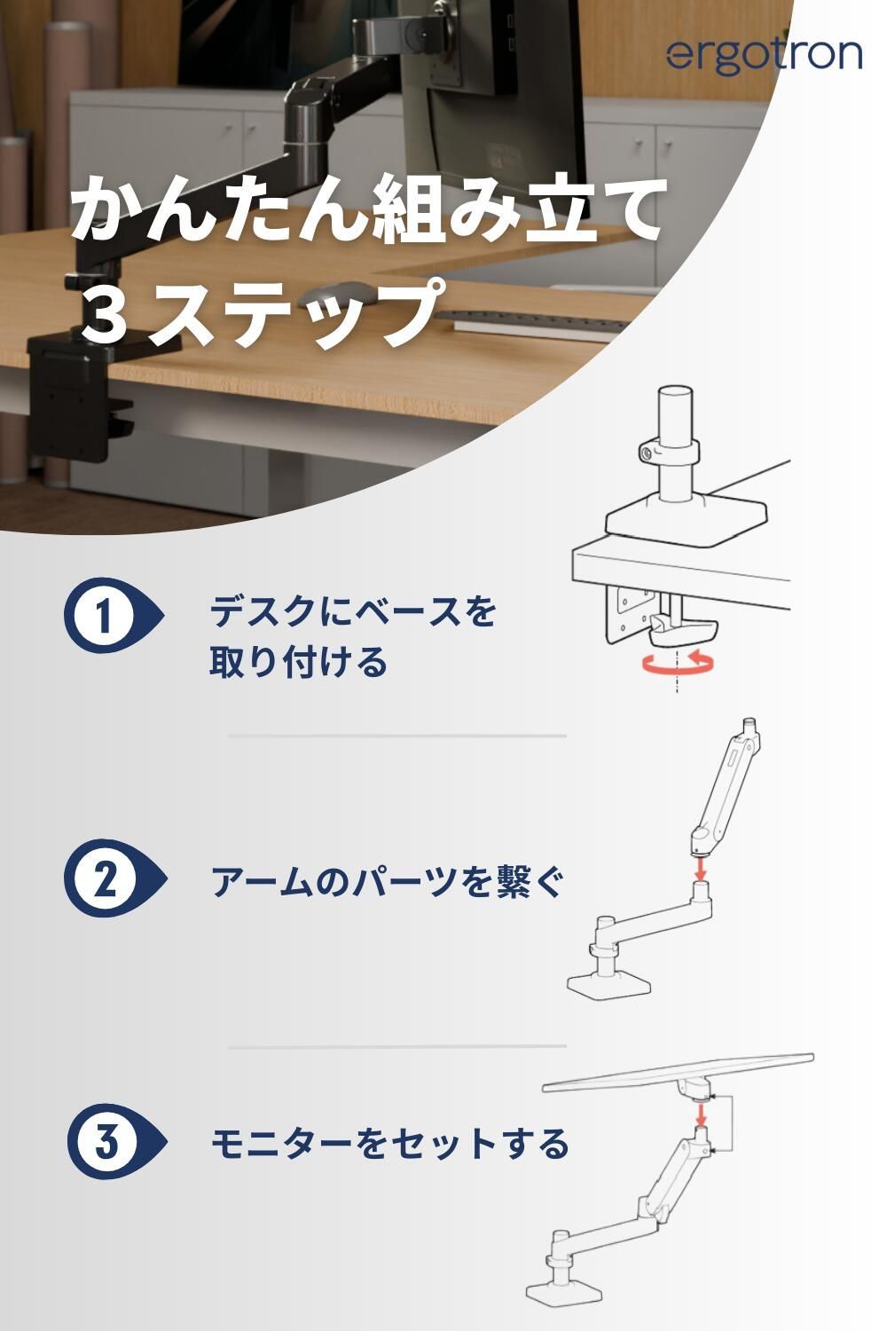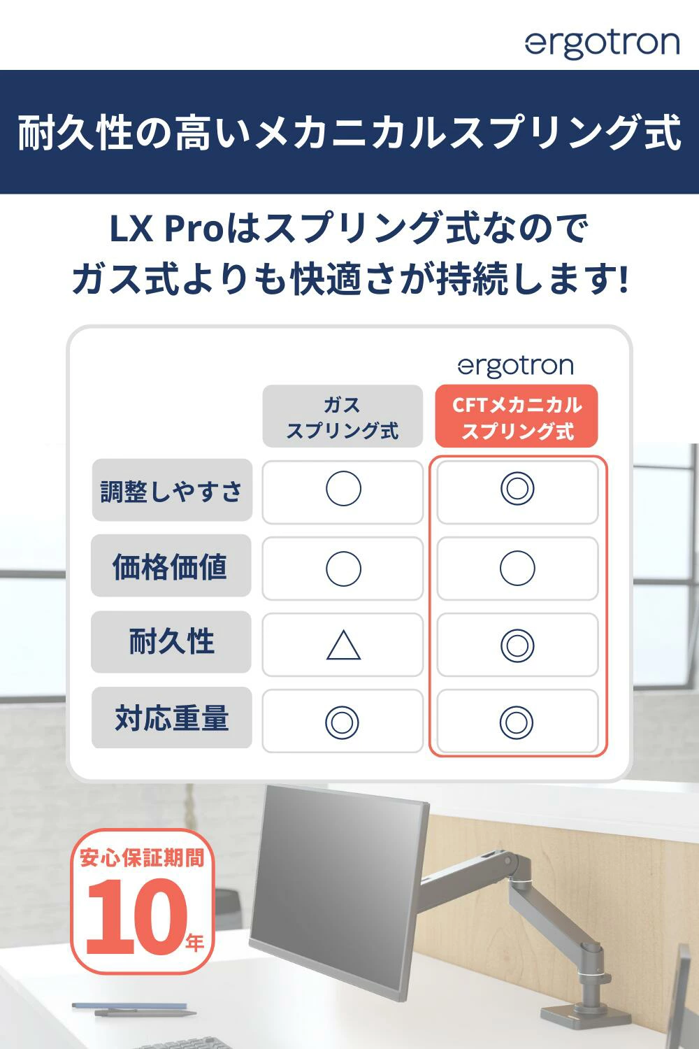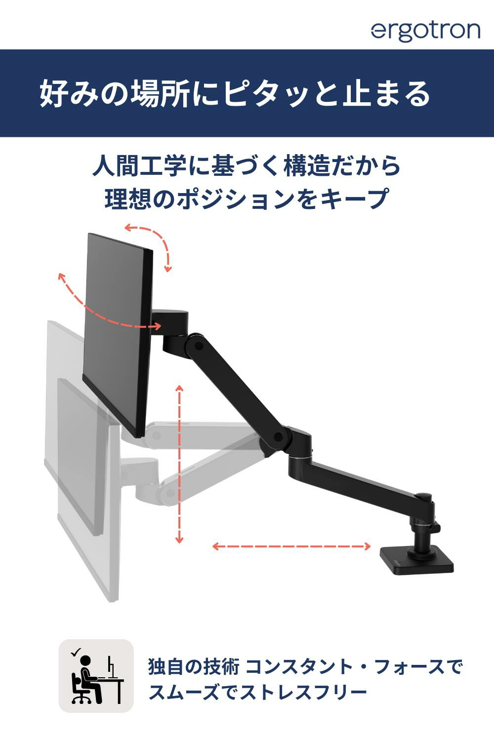 #1.8kg対応 #10kg対応 #34インチ対応 #VESA100x100 #VESA75x75 #チルト上70度 #チルト下15度 #ローテーション180度 #ローテーション360度 #テンションインジケーター #デスククランプ式 #天板60mm対応 #ケーブルマネジメント #簡単組み立て #LXProアーム #エクステンション付属 #モニターピボット付属 #標準ベース #ポール付属 #重量3.8kg #ブラック #ホワイト