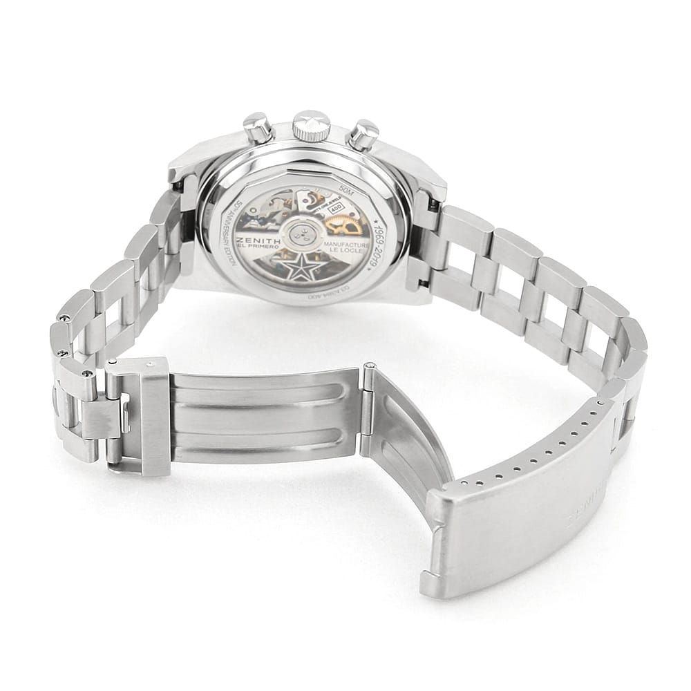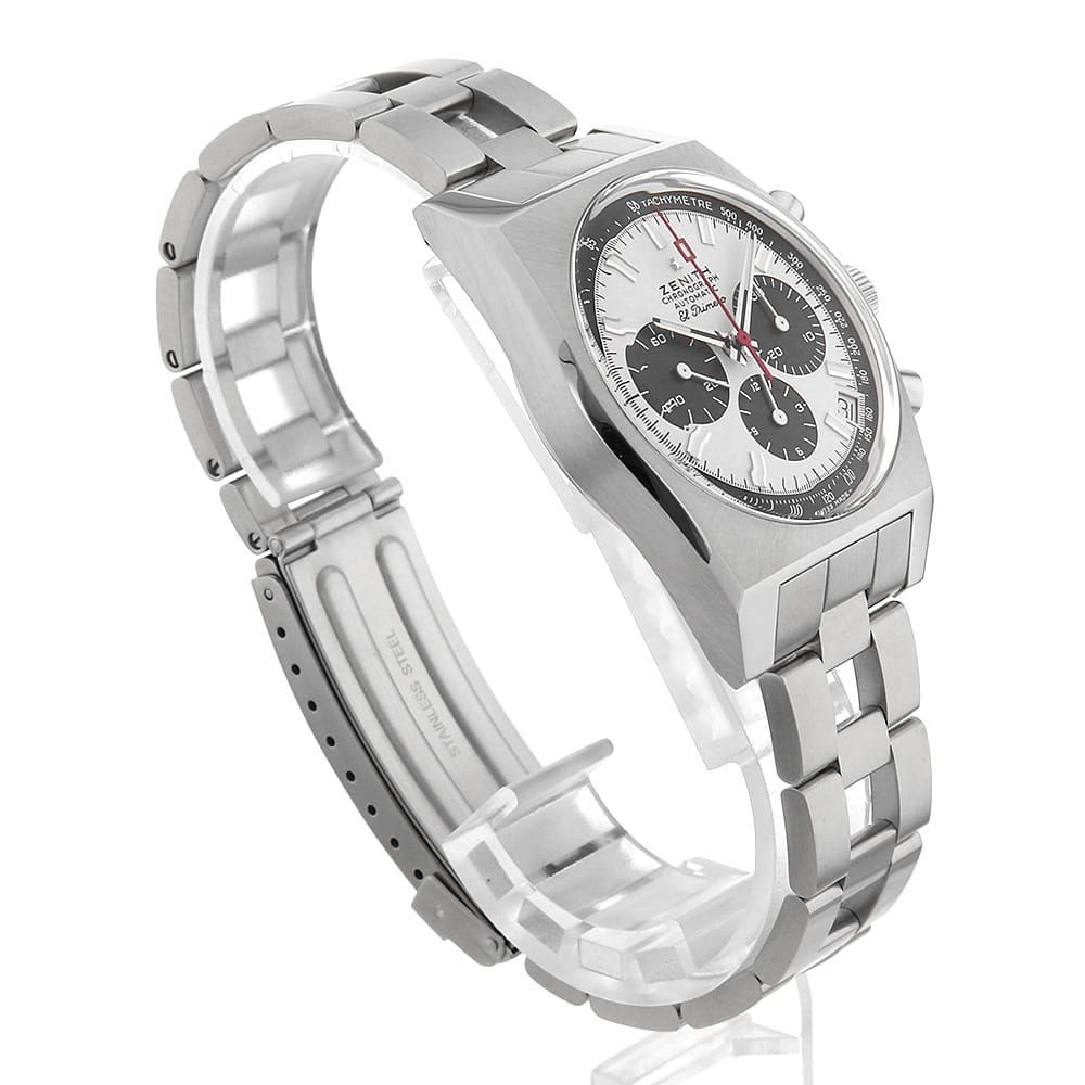■モデル情報:本モデルは、1969年に発表されたゼニスの名作を忠実に再現したモデルです。当時と同じ高振動自動巻クロノグラフムーブメント「エル・プリメロ」を搭載し、歴史的な名機の鼓動を現代に蘇らせています。特徴的なトノー型ケースとパンダダイアルは、オリジナルの製造計画をもとに細部までこだわって復刻され、ヴィンテージの雰囲気をそのまま再現しています。さらに、スチール製のラダーブレスレットを組み合わせることで、当時の佇まいをより一層リアルに感じられる仕上がりとなっています。