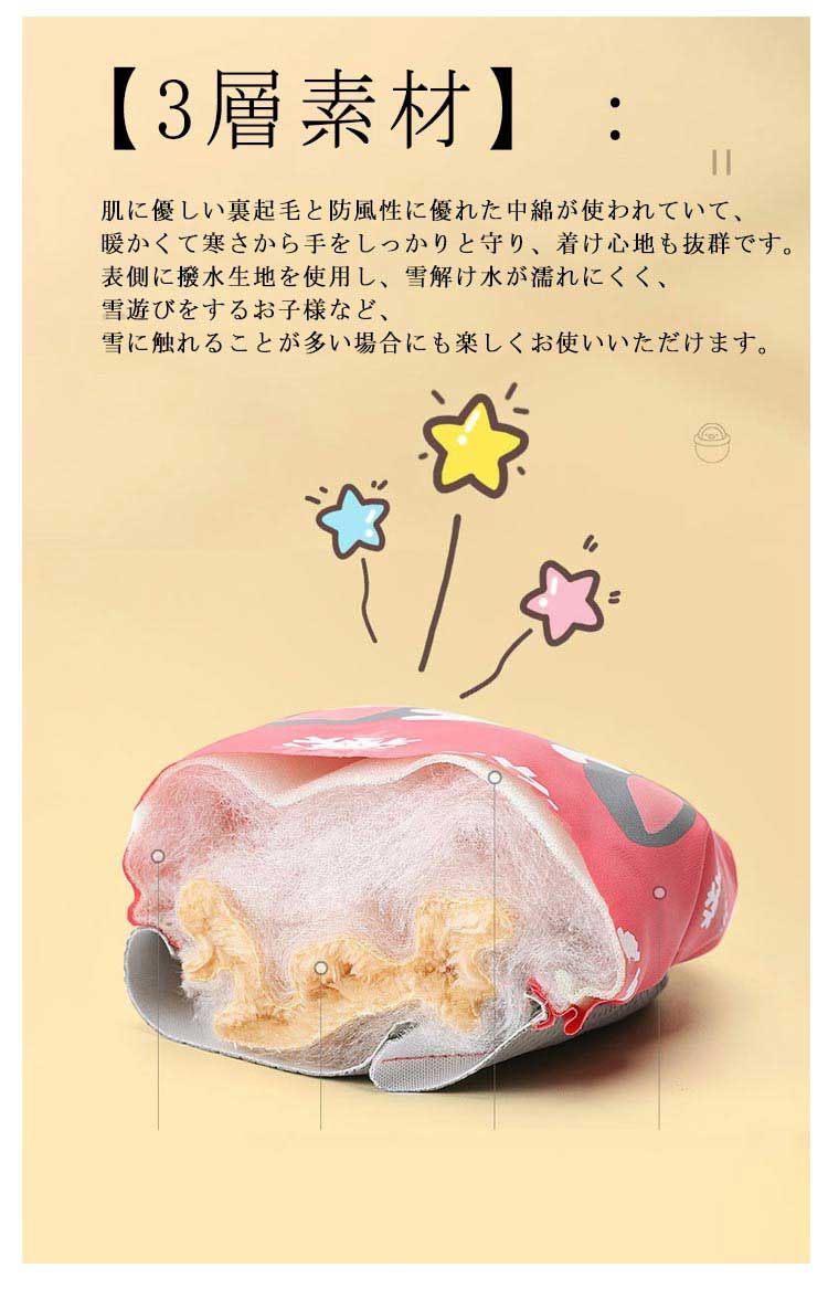 【3層素材】:肌に優しい裏起毛と防風性に優れた中綿が使われていて、暖かくて寒さから手をしっかりと守り、着け心地も抜群です。表側に撥水生地を使用し、雪解け水が濡れにくく、雪遊びをするお子様など、雪に触れることが多い場合にも楽しくお使いいただけます。