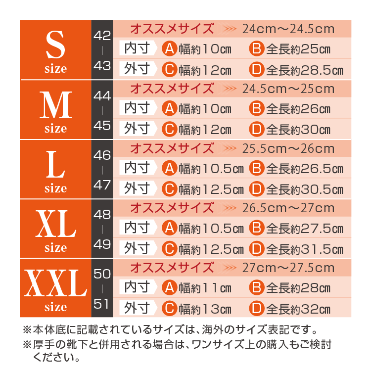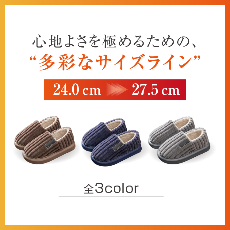 ・24cm~27.5cmの幅広い足の大きさに対応した豊富なサイズ展開です。