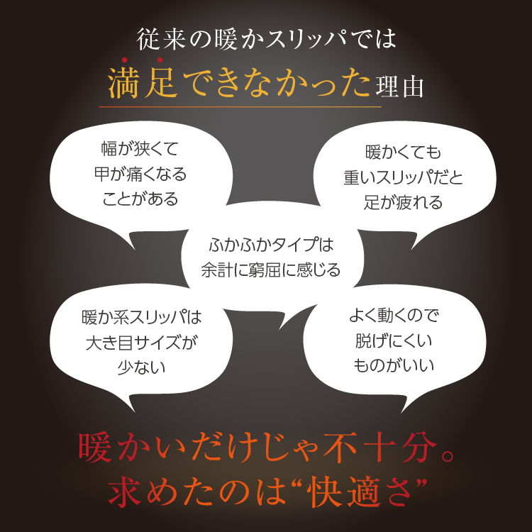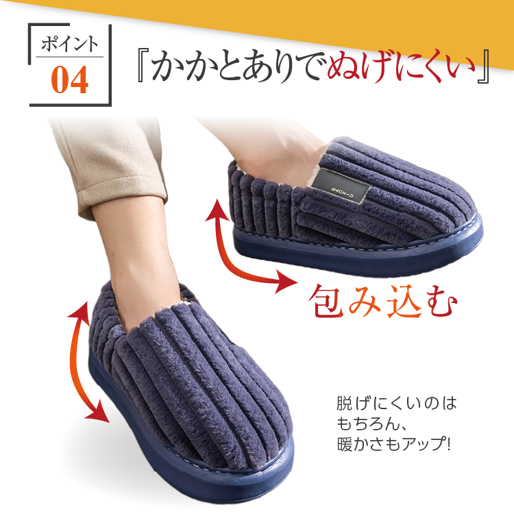 ・一般的なスリッパとは違い足全体を包み込み温かさを逃さない設計です。