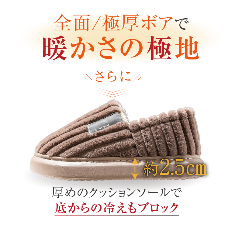 ・約2.5cmのもっちりとした弾力のある厚底ソールで長時間経っていても疲れにくく、床からの底冷えもしっかりブロックします。