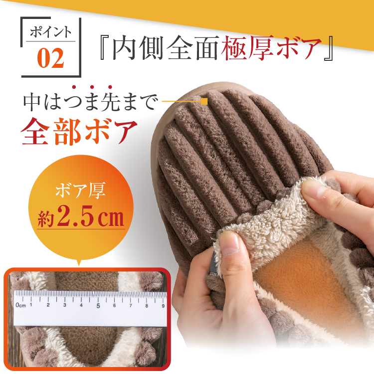 ・内側は足裏部分からかかと、つま先まで全面がボア生地なのでひんやり感を感じません。