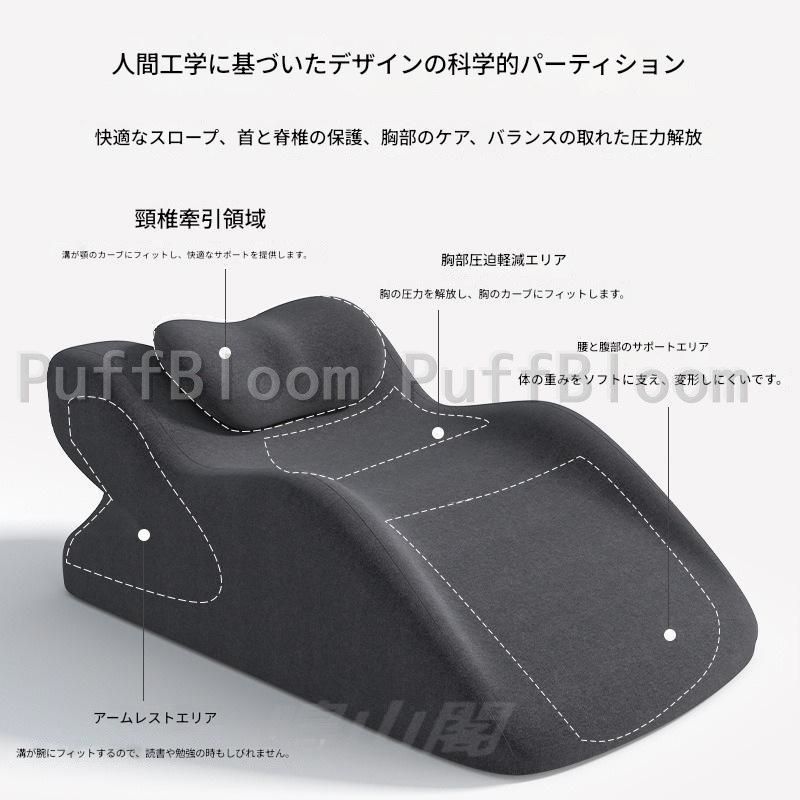 うつ伏せでの読書やゲーム、テレビ番組を見るなど、リラックスしたいときに最適なサポートを提供し、頸椎が痛くなりません。胸当てマクラ、バストマット、足枕、膝枕としても使用できます。大型でしっかりとしたサイズ感が特徴で、全身をサポートし、座ったり横になったりする際の快適さを追求しました。なお、ヘッドレストは取り外し可能です。